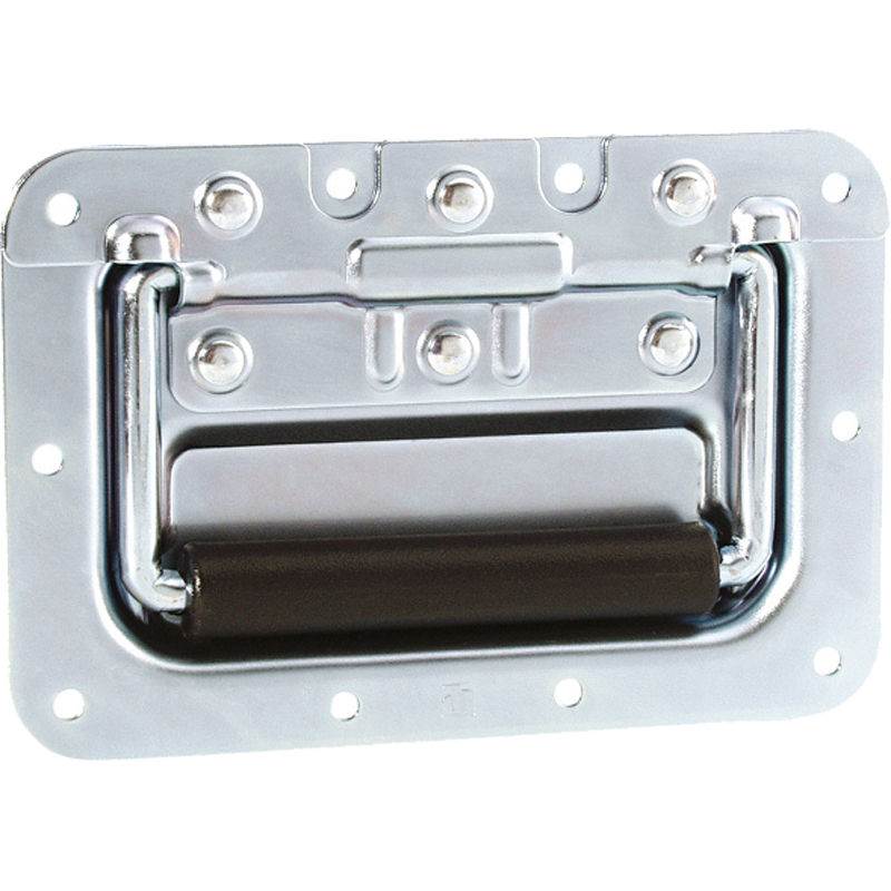 Medium metalna ručica sa oprugom za izradu kofera. Sama ručica je presvučena plastikom. Montaža na 10 rupa. Tacna je izraðena od pocinkovanog lima. Jedan od najpopularnijih modela ručica za izradu flight case kofera. Slična modelu 34082 ali sa debljom plastikom na grip-u i malo dubljom tacnom,