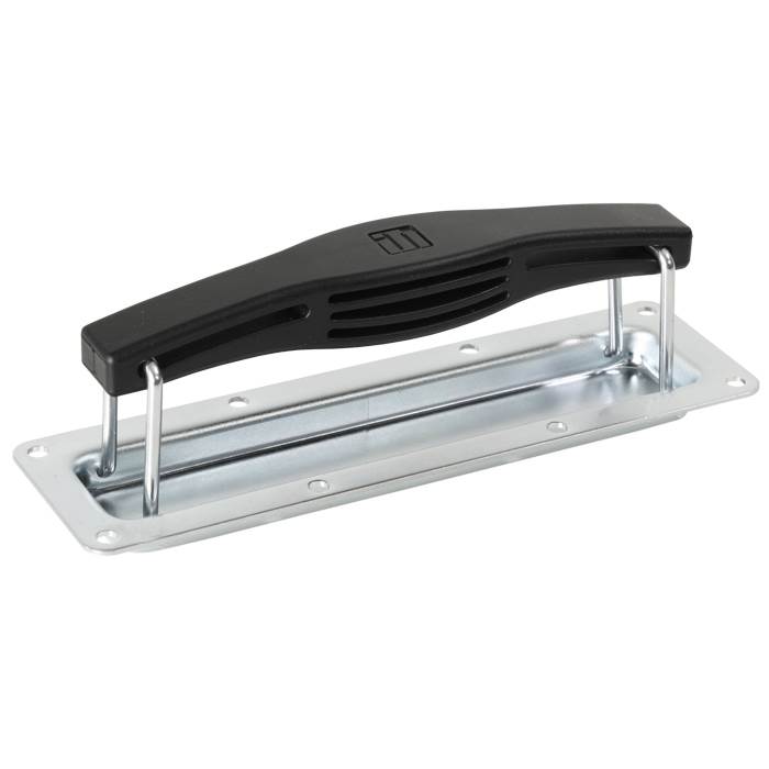 Gumena ručica za nošenje u pocinkovanoj tacni sa montažom na osam rupa. Odlična i diskretna ručica pogodna za kofere za instrumene ili lakšu opremu.
