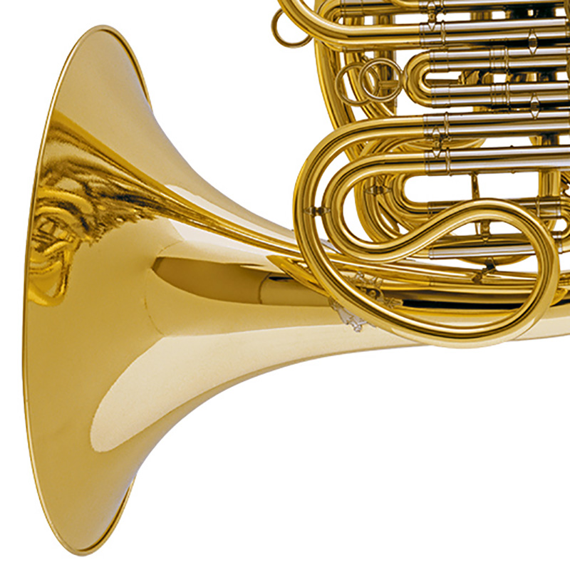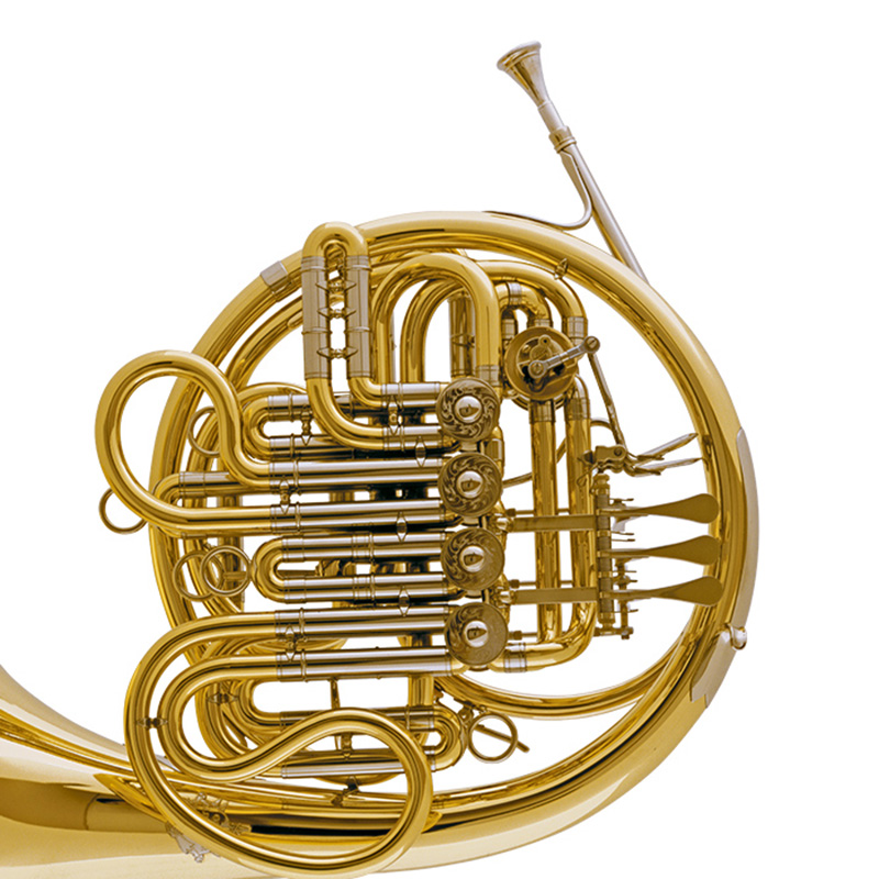 The double horn has established itself as the orchestral instrument of choice. The combination of full Bb and F horn offers the musician great flexibility in intonation and tone. There is also a definite correlation between mass and tonal projection. With full double horns the thumb valve serves to change to either the shorter Bb horn or the longer F horn. Model 104 bases on Model 103 with two thumb valves, but equipped with a second thumb lever to operate the 5th valve. The musician can choose between half tone or stopping length by a removable extension slide.