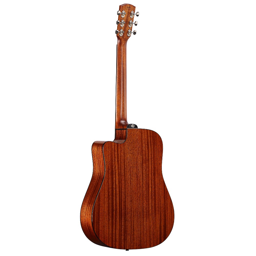 - Zvučno, ova gitara je sve što biste očekivali od potpuno čvrstog tela Dreadnought mahagonija. Dizajniran je da pruži snažan i artikulisan ton, trenutni odgovor i otvoreniju projekciju nego što se obično povezuje sa vrhovima od tvrdog drveta.