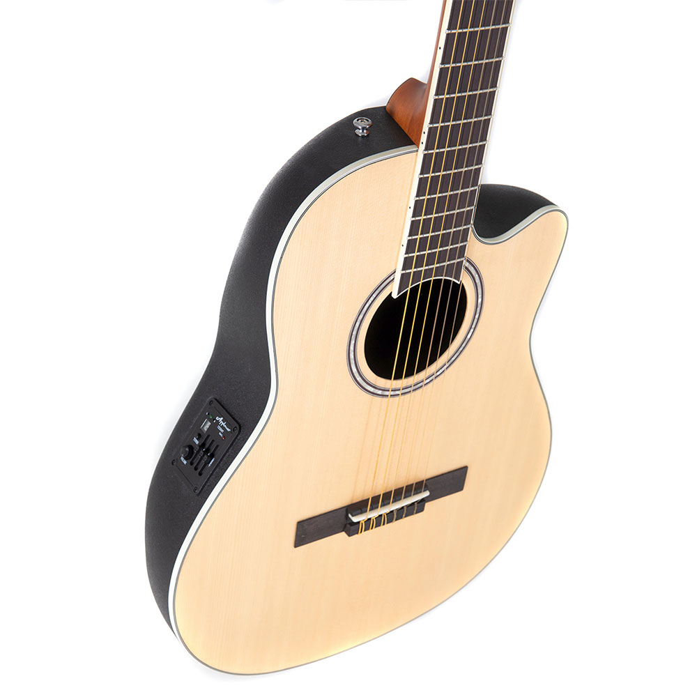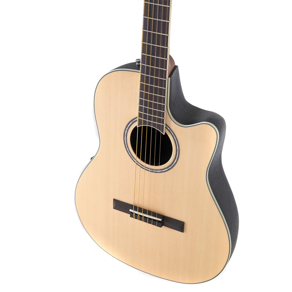 Najlonska verzija po performansama lako parira akustičnoj braći. Prepoznatljiva i dokazana konstrukcija, Lyrachord telo srednje dubine, sa isečkom, od kompozitnog materijala, sa gornjom pločom od laminirane smreke. Mahagoni vrat slim neck konstrukcije, sa 18 pragova, izuzetno udobnog profila. Ugrađena CE304T ozvuka profesionalnog kvaliteta, sa integrisanim štimerom. U elegantnom Natural Satin finišu.