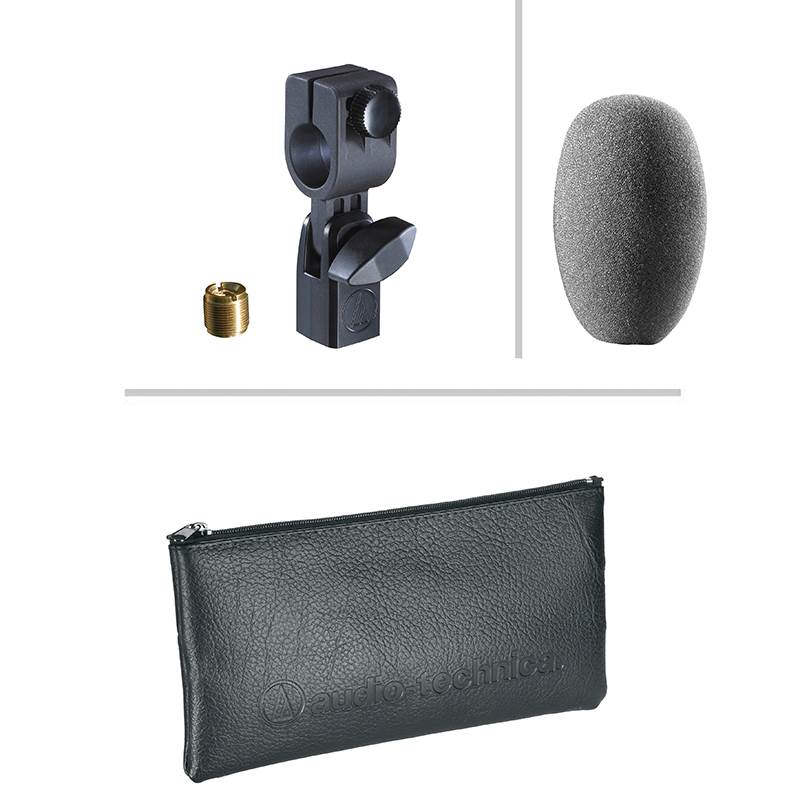 - Accessories: AT8471 isolation clamp for 5/8"-27 threaded stands; 5/8"-27 to 3/8"-16 threaded adapter; AT8136 windscreen; soft protective pouch