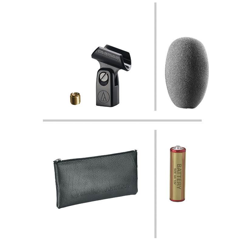 - Accessories: AT8405a stand clamp for 5/8"-27 threaded stands; 5/8"-27 to 3/8"-16 threaded adapter; AT8136 windscreen; battery; soft protective pouch