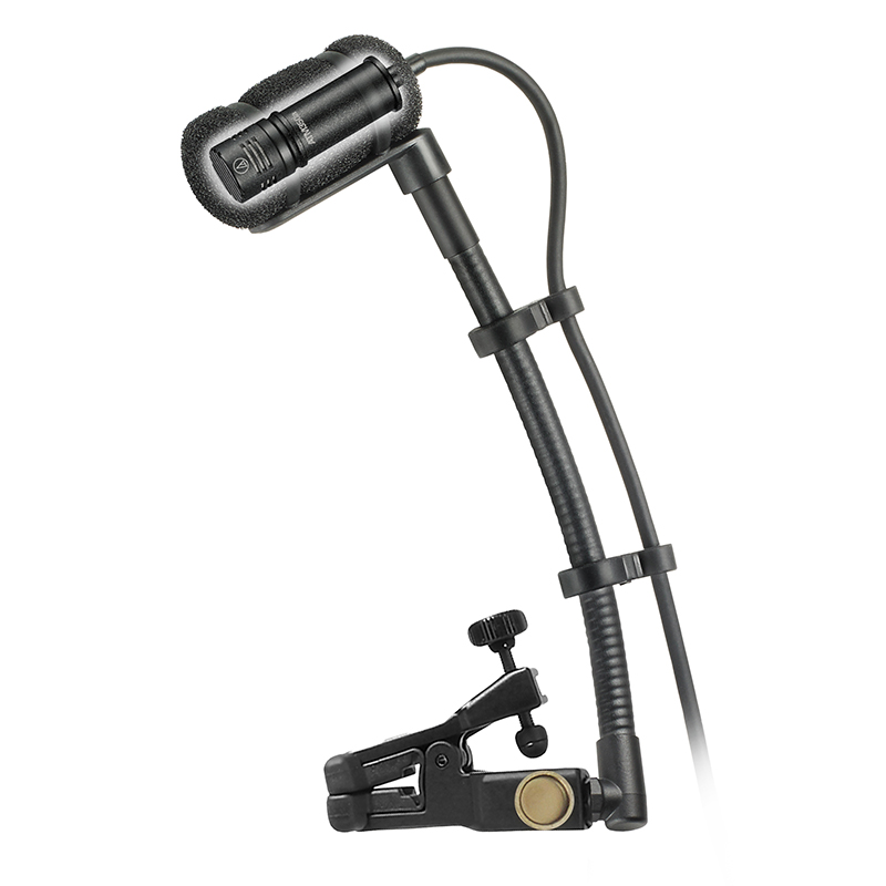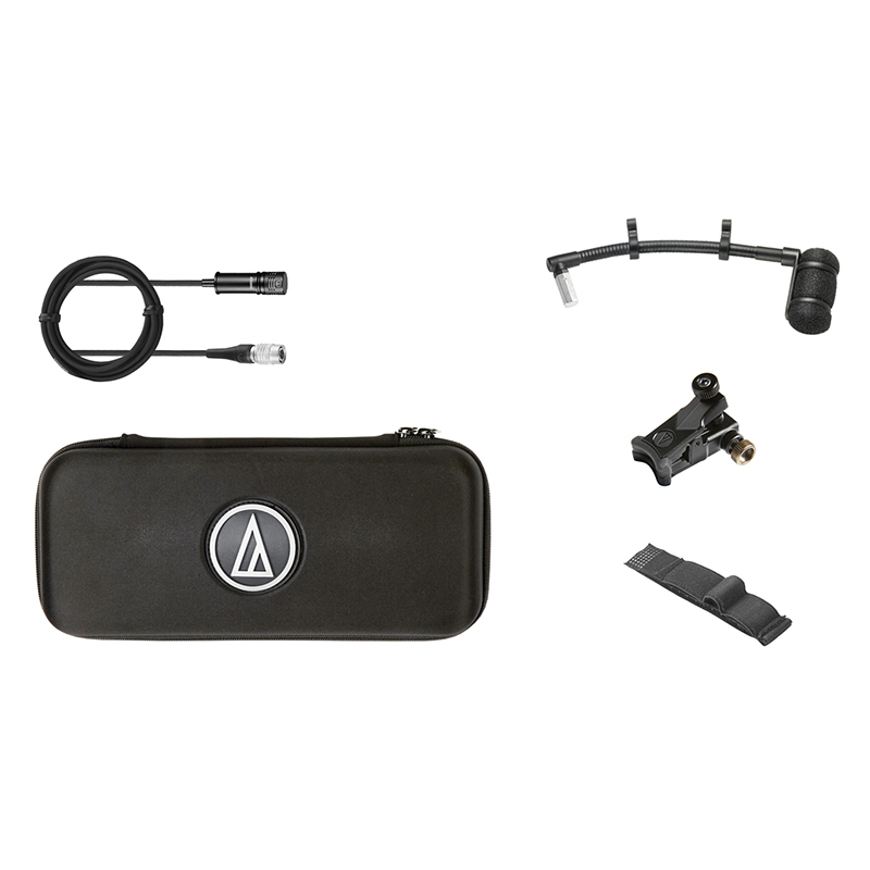 ATM350U Cardioid Condenser Clip-on Instrument Microphone, less power module. 55” (1.4 m) permanently attached miniature cable terminated with a locking 4-pin connector for use with Audio-Technica cW-style body-pack transmitters. Includes AT8491U Universal Clip-on Mount, AT8490 5" Gooseneck, AT8468 Violin Mount (hook-and-loop fastener), and Protective Carrying Case.