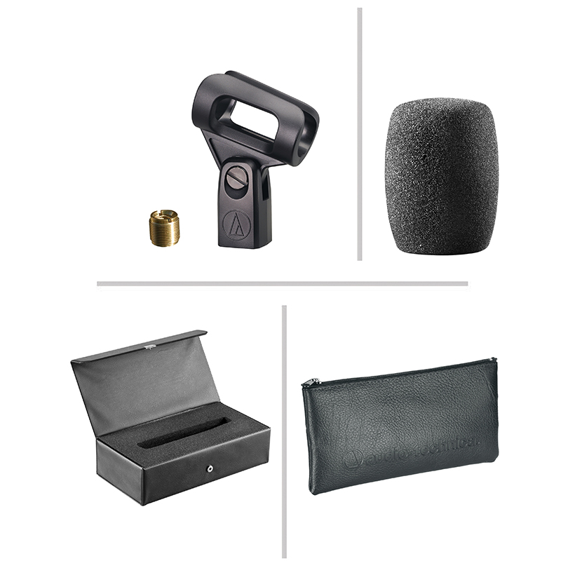 - ACCESSORIES FURNISHED AT8470 Quiet-Flex™ stand clamp for 5/8"-27 threaded stands; 5/8"-27 to 3/8"-16 threaded adapter; foam windscreen; carrying case; soft protective pouch