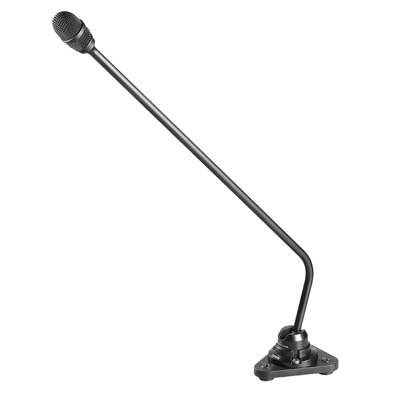 The new Engineered Sound®. Contractor-exclusive innovations for every acoustical challenge. And safe haven from RFI. The ES905CL is designed for quality sound reinforcement, professional recording, television and other demanding sound pickup applications. Its rigid-pipe design with ball-in-socket base permits flexible positioning, while its durable metal base mounts to a table, desk or podium with included hardware. The attached wire mesh windscreen with internal pop protection effectively reduces noise from P-pops, wind, and ventilation air currents. The microphone offers unsurpassed immunity from radio frequency interference thanks to UniGuard® innovations. The ES905CL also offers an 80 Hz low-cut UniSteep® filter that reduces pickup of low-frequency ambient noise. The microphone’s low-profile element provides a uniform cardioid polar pattern with a 120º acceptance angle. Power module included.