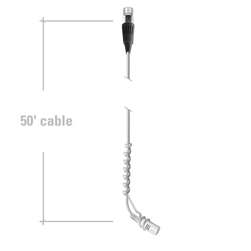 - CABLE 15.2 m (50') long (permanently attached to microphone), 3.2 mm (0.13") diameter, 2-conductor shielded cable, terminated with TA3F-type connector