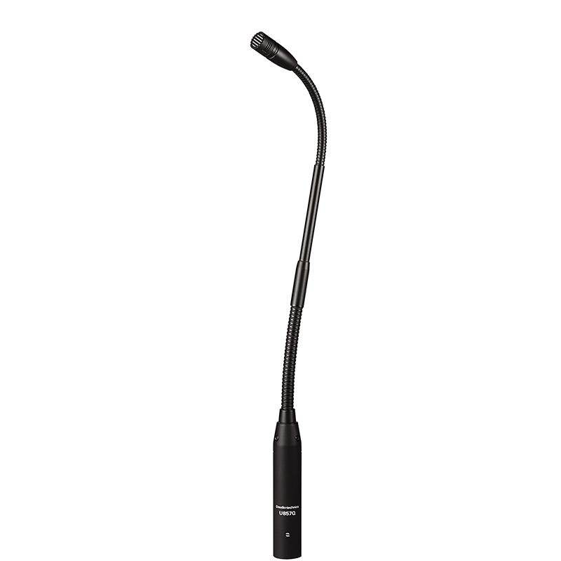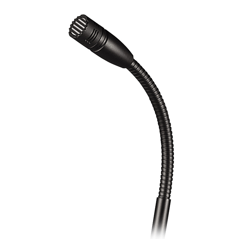 Ideal for conference centers, boardrooms, courtrooms, houses of worship, and other installed applications, the U857Q is designed to plug directly into a panel- or desk-mounted XLRF-type connector. This cardioid condenser quick-mount gooseneck microphone offers unsurpassed immunity from radio frequency interference thanks to Audio-Technica’s UniGuard® innovations. The 14.47” long microphone features an ultra-flexible small-diameter gooseneck and accepts interchangeable elements, available in cardioid, hypercardioid, omnidirectional and UniLine® line cardioid polar patterns. Equipped with self-contained electronics, the phantom-powered microphone also offers an 80 Hz low-cut UniSteep® filter that reduces pickup of low-frequency ambient noise.