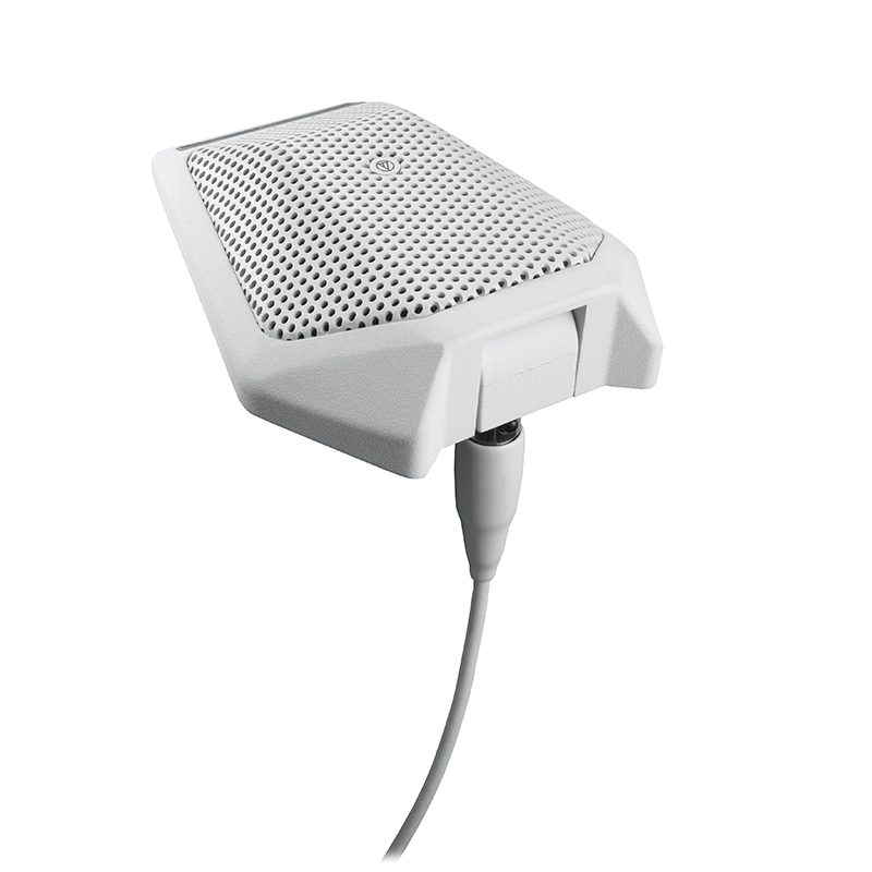 Designed to deliver easy, flexible control in conference and boardroom installations, the versatile U891R cardioid condenser boundary microphone features an activation switch that can be set to three modes: press-on/press-off, press to talk, and press to mute. The phantom-powered microphone is equipped with a unique PivotPoint® rotating output connector and an LED status indicator. UniGuard® innovations offer unsurpassed immunity from radio frequency interference; interchangeable elements are available in cardioid, hypercardioid and omnidirectional polar patterns; an 80 Hz low-cut UniSteep® filter reduces pickup of low-frequency ambient noise. The microphone’s heavy die-cast case and silicon foam bottom pads minimize coupling of surface vibration to the microphone. The unit’s self-contained electronics eliminate the need for an external power module.
