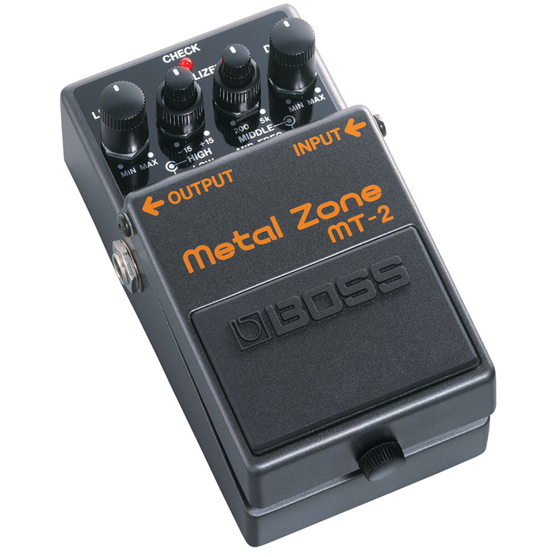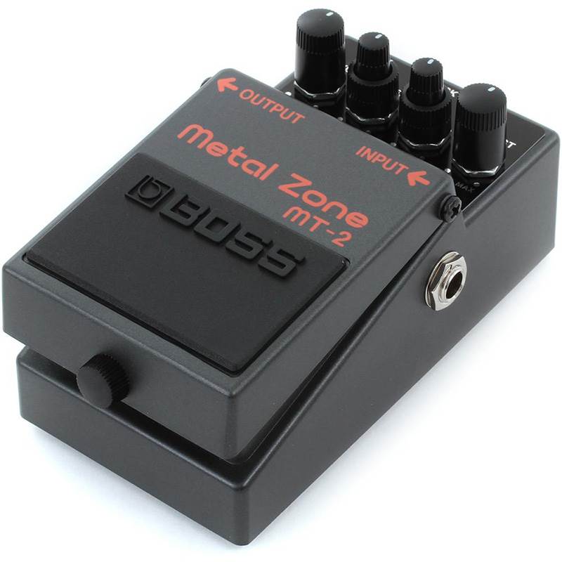 Boss MT-2 Metal Zone. Poseduje dual-gain elektroniku i daje jaku, cevnu distorziju sa teškim izobličenjem u srednjim i niskim frekvencijama i dugim sustainom. Tropojasni EQ sa polu-parametarskim srednjim opsegom donosi vam ekstremne zvuke.