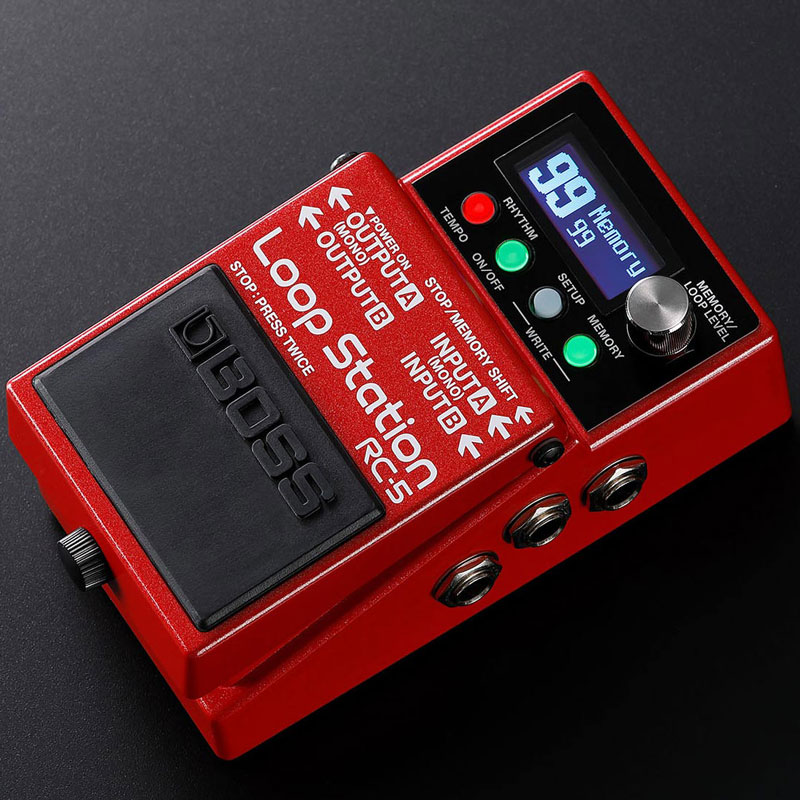 Boss RC-5 Loop Station. The latest iteration of BOSS's iconic red-boxed looper pedals. Gives you 13 hours of pristine 32-bit stereo record time parceled out into 99 Phrase Memories. Phrase Memories store not only base loops and overdubs you've laid down. But also with tempo and reverb assignments to any of the 114 onboard drum grooves and seven drum kits you've chosen for accompaniment. This takes the RC-5 far beyond traditional looper territory and into something more akin to song management. Now you can quickly lay down chords, bass lines, melodies, and rhythms for scratch padding new ideas to potential bandmates. Or you can zhuzh up those loops and turn them into full-production live solo accompaniment. And thanks to the RC-5's USB connection, you can easily backup and reload loops by the setful. Through it all, the BOSS RC-5 Loop Station remains fast to learn, easy to use, and endless fun to play around with. The animated RGB backlit LCD keeps you apprised of measure, beat, and loop status every step of the way.
