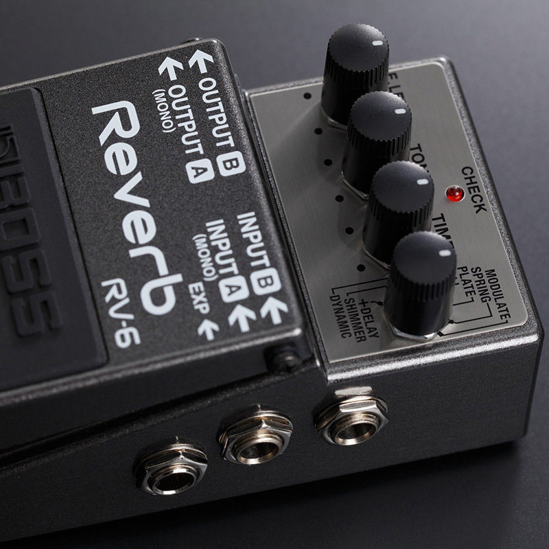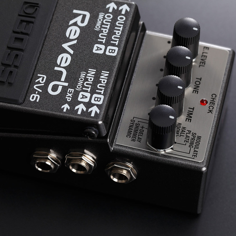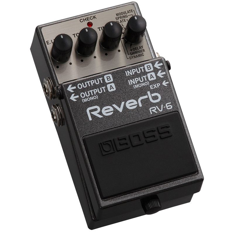 Boss RV-6 Reverb. Combining high-end sound and wide-ranging versatility. RV-6 takes pedal-based reverb to the next level. Reaching beyond the capabilities of previous generations. This powerful stomp employs the latest tech and legendary BOSS know-how to make it easy to get amazing reverb tones instantly. From subtle rooms to modern shimmer effects to long, evocative reverbs. The RV-6 envelops your tone in lush ambient spaces that endlessly inspire. While the RV-6’s reverb effects are high-tech digital. You can rest assured that your straight guitar tone always remains pure analog as the effect is blended in. Convenient auto-switching jacks let you integrate with any pedal chain, with support for mono, mono-to-stereo, and stereo-to-stereo operation. And by plugging into the B input only, the RV-6 outputs a 100-percent wet sound, great for working with more complex rigs that employ parallel processing chains and mixers. There’s also a jack for connecting an optional expression pedal, allowing you to control the effect level in real time as you play.