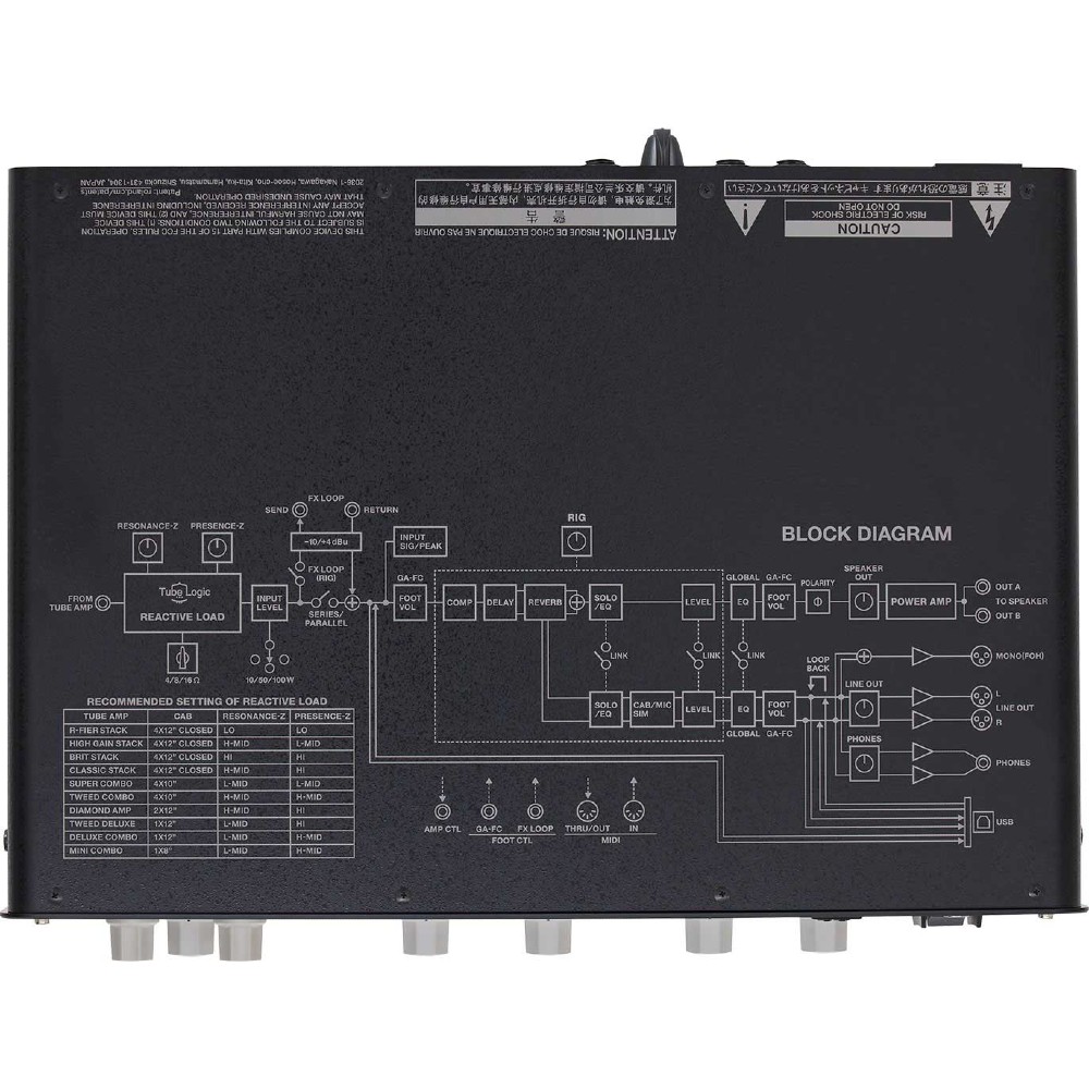 - FROM TUBE AMP jack: 1/4-inch phone type SPEAKER OUT jacks (OUT A, OUT B): 1/4-inch phone type LINE OUT L/R connectors: XLR type LINE OUT MONO (FOH) connector: XLR type PHONES jack: Stereo 1/4-inch phone type SEND jack: 1/4-inch phone type RETURN jack: 1/4-inch phone type FX LOOP jack: 1/4-inch phone type GA-FC jack: 1/4-inch TRS phone type AMP CTL jack: 1/4-inch phone type USB COMPUTER port: USB B type MIDI (IN, THRU/OUT) connectors AC IN jack