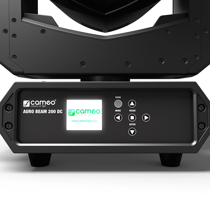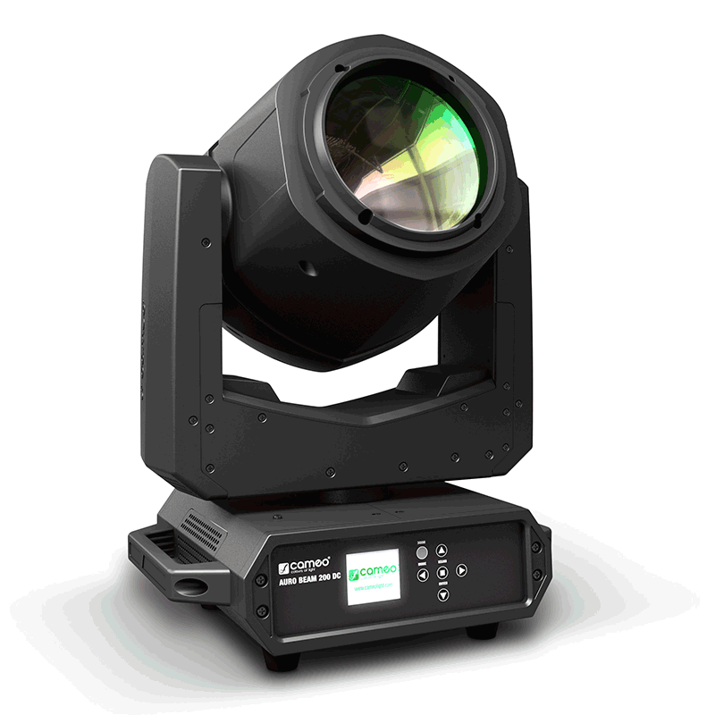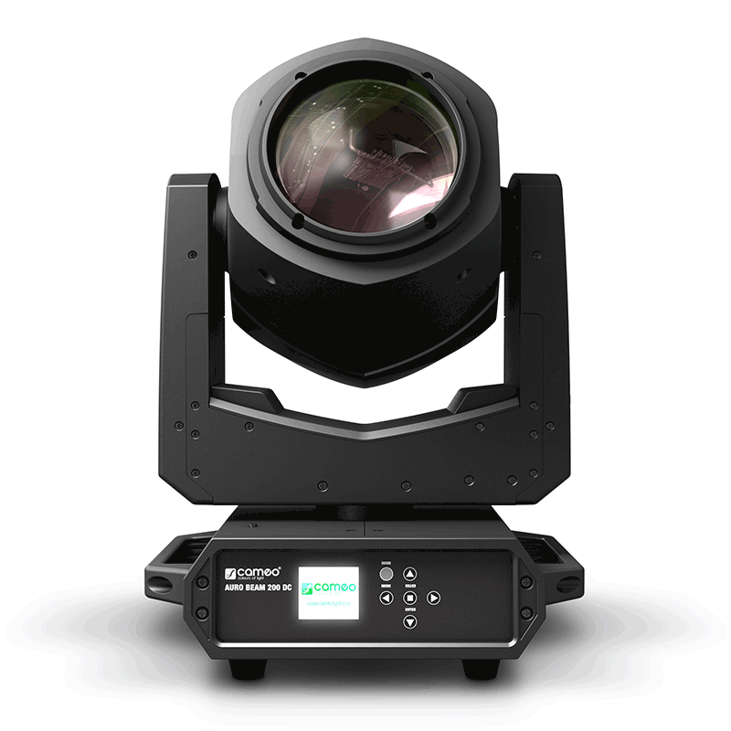 The Cameo AURO® BEAM 200 DC is a super fast Beam Moving Head with extremely narrow 3° beam, motorized focus and 16-Bit 3-phase motors providing 630° pan and 235° tilt. Equipped with a powerful 7,800 K Osram Sirius HRI 132 W discharge lamp, it generates a huge illuminance of 480,000 lx at 5 m distance. The luminaire's colour wheel offers a selection of 14 dichroic filters including CTO plus white. In addition to 14 gobos, the AURO® BEAM 200 DC features 8-facet circular and 5-facet linear prisms which are rotatable and overlapping to create stunning effects. It includes dimming and strobe functions, automated programs for standalone operation and a temperature-controlled low-noise fan. The AURO® BEAM 200 DC supports the RDM protocol and sports a battery-powered full colour menu display for convenient offline configuration. Neutrik 3-pin and 5-pin DMX and powerCON input and output connectors enable easy daisy chaining. The Beam Moving Head comes with 2 Omega brackets and power cord.