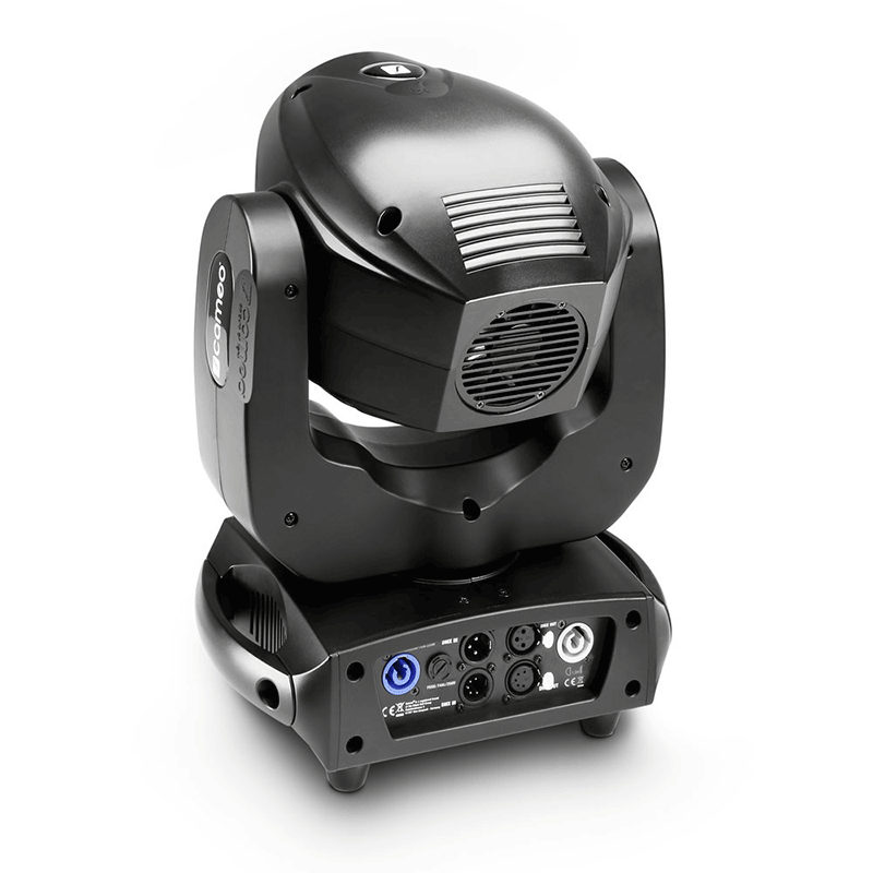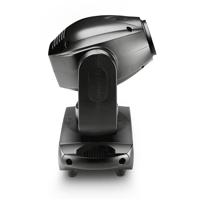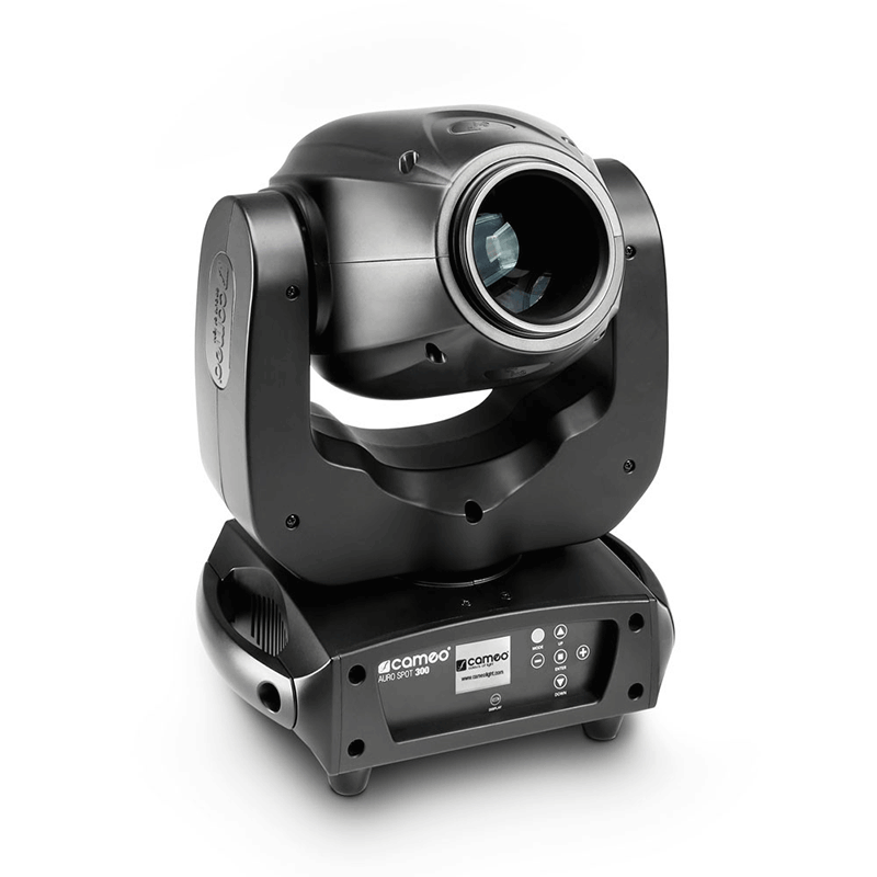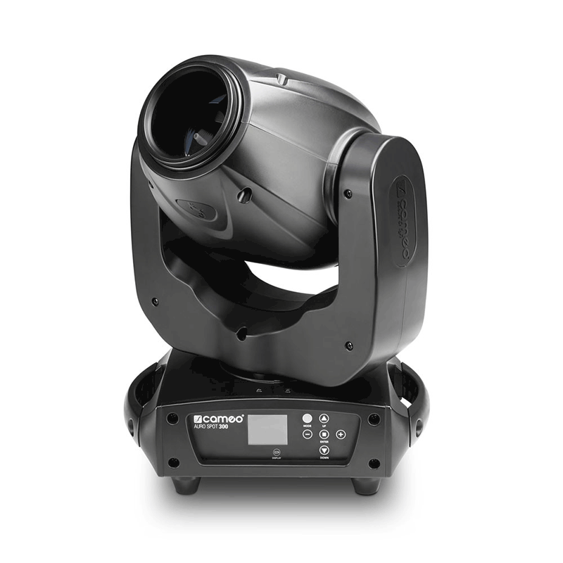 The Cameo AURO® SPOT 300 is an RDM-capable ultra bright moving head with 16-bit resolution, 630° pan and 235° tilt movement and high speed 3-phase motors. It is powered by a single 180 watt LED and sports 8 intense colors plus white and split colors. A rotating 3-facet prism, 8 fixed and 6 replaceable rotating gobos provide a wide variety of awesome animated effects. The AURO® SPOT 300 features 5-channel, 15-channel, 24-channel DMX control modes, automated programs and sound activation as well as master, slave and standalone capabilities. Functions include a choice of 4 smooth dimming curves, gobo shake and a high-speed 0 - 20 Hz cycle strobe. The heavy-duty housing integrates a temperature controlled low noise fan, 3-pin and 5-pin DMX plus Neutrik powerCON inputs and outputs. A battery-powered 6-button display enables convenient offline configuration. The all-professional multi-voltage AURO® SPOT 300 operates on 100 - 240 V AC.