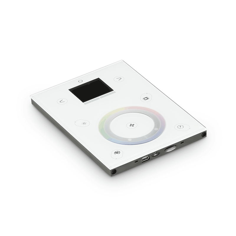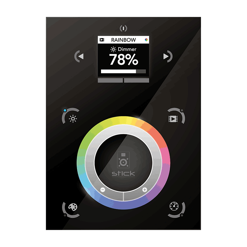 Total lighting control right at your fingertips, just as easy as flicking a switch - with Cameo's Stick Edition Multi-Zone Control Pad there is no need to navigate through complex menus. Select a zone and use the touch sensitive scroll wheel or tap the dedicated quick access touch buttons to choose from static or dynamic scenes, set dynamic scene speed and adjust brightness with the dimmer function. The colour palette offers a selection of more than 16 million RGB colours. With 1,024 DMX channels, 500 scenes and 10 zones, the Stick Edition DMX Control Pad is designed to provide an extremely user-friendly control solution even for the most demanding lighting installations. Featuring USB and Ethernet connections, it is networkable and compatible with ESA, ESA2, ESA Pro and ESA Pro 2 software for Mac and Windows and remote control apps for iOS and Android devices. Available in black or white, the wall controller features a high-quality tempered glass front panel that includes a graphical display of settings and full-colour scene images.