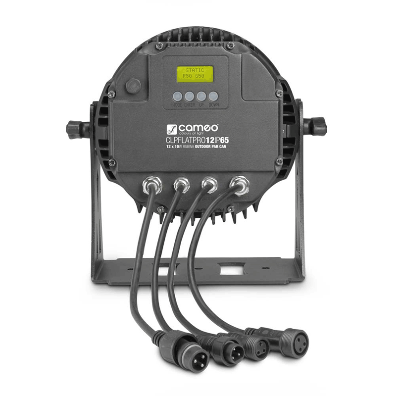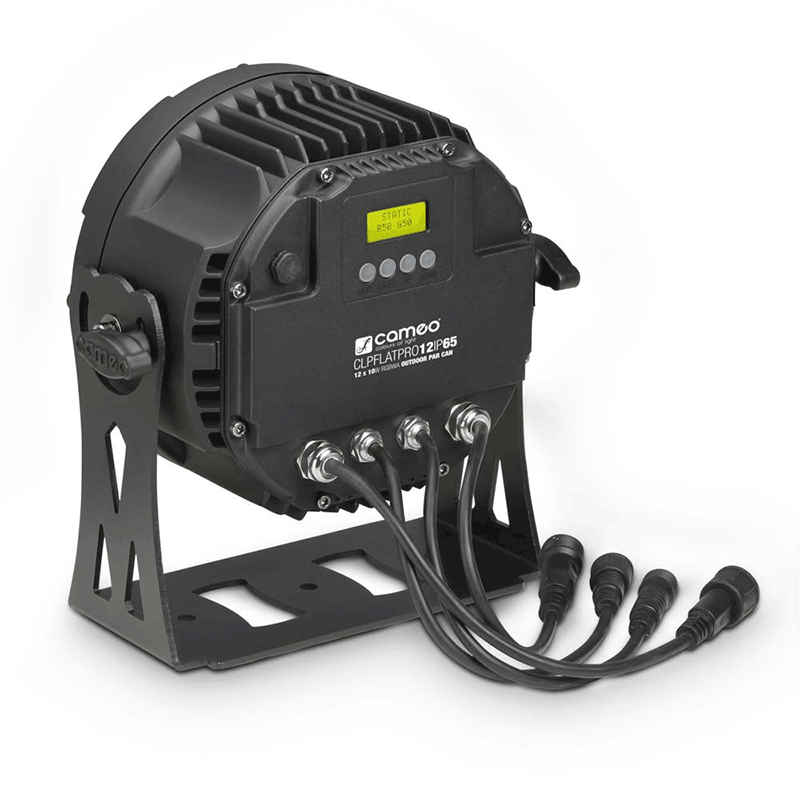 Featuring an IP65 rating according to EN 60529, the Cameo CLPFLATPRO12IP65 professional PAR light supports vibrant lighting in the open. The super slim design is ideal where space is limited while the convection cooling design allows a 100% silent operation. 12 ultra bright high performance 10 watt RGBWA LEDs produce a wide range of colours from soft pastel hues to rich, warm tints with an intense 15.000 lux and 30° beam angle. In addition, the 3,000 Hz refresh rate eliminates flicker. The CLPFLATPRO12IP65 sports a total of 5 DMX modes with multiple functions, built-in programs and an LED Display with 4 controls for easy manual operation. It also provides master, slave and standalone capability. The Cameo CLPFLATPRO12IP65's rugged die-cast enclosure is totally protected against dust and low pressure water jets from all directions. The purpose design includes dedicated screw connectors for DMX signal and power input and output to enable daisy-chaining up to 10 units. The universal bracket offers various mounting options.