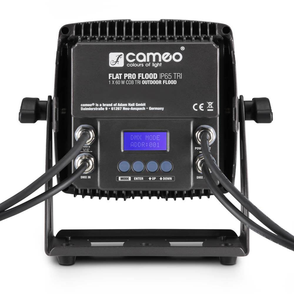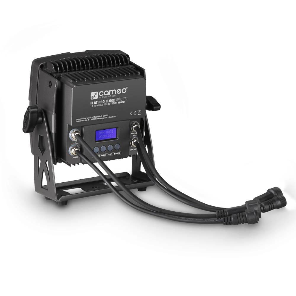 Cameo FLAT PRO Flood IP65 TRI je reflektor namenjen spoljašnjoj upotrebi. LED od 60 W Tri-Color COB smešten u crnom metalnom kućištu. Predviðen za upotrebu na otvorenom sa IP65 rejtingom, 120° snopom svetlosti i hlaðenjem. Sposoban da generiše bogate, zasićene RGB boje sa stopom osvežavanja od 3000Hz što omogućava rad bez prekidanja. Crno kućište nazadnjem panelu ima konektore na zaključavanje i LCD displej sa mode, enter, up i down tasterima za laku kontrolu i upotrebu.