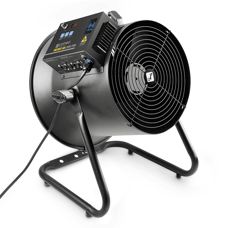 Adding touches of drama and dynamics to any event, the Cameo Instant Air 2000 Pro is a professional high velocity wind machine producing a powerful 56 m³ air flow per minute. It generates a wide range of wind effects from a gentle breeze to strong, heavy gusts sporting precision fan speed control in one percent increments and continuously adjustable air flow direction. The Instant Air 2000 Pro can be operated via DMX or in standalone mode and includes a convenient RF remote control. It features 3-pin and 5-pin DMX inputs and outputs, an easy-to-read LED display and virtually silent operation thanks to its ultra quiet 31 cm fan. Designed for both floor standing applications and hanging from trusses, the Cameo Instant Air 2000 Pro is ideal for fashion shows, film and photo studios, theatres, theme parks and live concerts. It is also the perfect addition to fog and haze machines and enhances their performance.