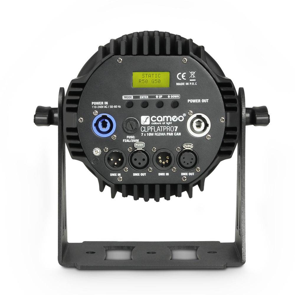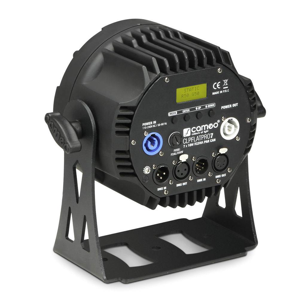 Cameo FLAT PRO7 je LED rasveta tipa FLAT RGBWA LED PAR u rasporedu svetla 7x10W. Mogućnost daljinske kontrole. Ravna PAR kanta i sadrži 7 LED dioda jačine 10W sa kombinacijom 5-u-1. Veoma široke primene, u različitim svetlosnim kombinacijama sa prirodnim i toplim bojama. Kućište ima duple držače koji omogućavaju da se reflektor okači ili kokristi u podnoj postavci. Super tanki dizajn omogućava postavku na veoma malim i slabo pristupačnim površinama. Na zadnjem panelu se nalaze mestima gde je prostor ograničen. Poseduje 3-pinske i 5-pinske DMX in, DMX out kao i Neutrik PowerCon konektore za napajanje koji omogućavaju povezivanje do 10 ureðaja u niz.