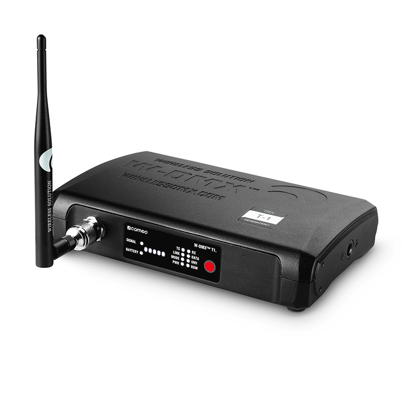 The Cameo W-DMX™ T1 is a member of Wireless Solution's acclaimed BlackBox series of transceivers for wireless lighting control supporting both transmit and receive modes of DMX and RDM signals in the 2.4 GHz frequency band. Built for professional applications, the roadworthy die-cast metal housing is packed with patented W-DMX™ technologies. These include Adaptive Frequency Hopping to automatically avoid interference created by other wireless networks, and Data-Safe error correction that protects DMX and RDM data from corruption. The Cameo W-DMX™ T1 features Neutrik 3-pin and 5-pin DMX inputs and outputs, an automatically switching power supply for multi-voltage operation plus a gold-plated Phoenix connector for 12 V battery powering. The G4S transceiver is backward compatible with W-DMX™ G3 units enabling the use of both in a single system. It comes with a 5 dBi single-band antenna providing an operating range up to 500 m, N-type antenna adapter and a 19" rackmount kit.