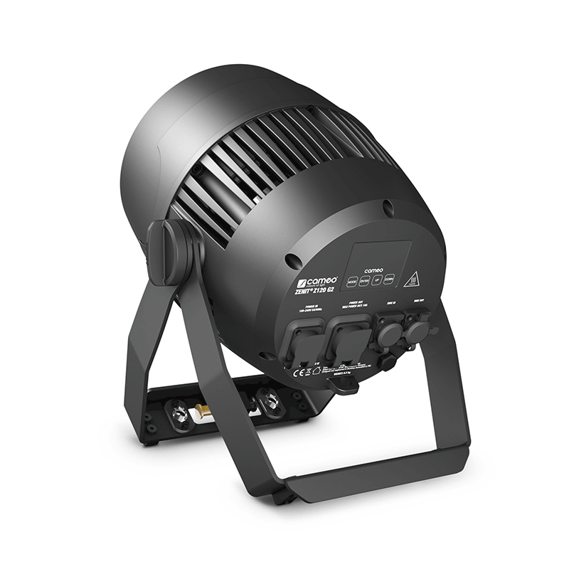 Following the hugely successful ZENIT® Z 120, Cameo now introduces the ZENIT® Z 120 G2 featuring an OLED display and patent pending mounting bracket which integrates a super clamp stud. The RDM enabled high output PAR can for demanding professional applications employs a single long-life 120 watt RGBW COB LED and 16-bit technology for vivid high-resolution colour mixes with maximum uniformity and perfect dimming behavior. Covering a range from 7° to 55°, the motorized zoom provides flexible illumination from tightly focused, narrow beams to wide, diffuse washes. With a 3.600 Hz refresh rate for flicker free operation and IP65 rating the ZENIT® Z 120 G2 is eminently suitable in TV, film and outdoor applications. The PAR can's advanced features include colour temperature correction, variable white balance and 4 selectable dimming curves with adjustable response to mimic the ramp-down of halogen bulbs. Sporting 7 modes of DMX control, the ZENIT® Z 120 G2 is also capable of master, slave and standalone operation. A bright OLED display with 4 touch buttons facilitates menu navigation and configuration while a security lock prevents unauthorized access. The heavy-duty diecast aluminium housing utilizes highly efficient convection cooling for completely silent operation. 5-pin DMX connectors e powerCON TRUE1 enable daisy chaining. The Cameo ZENIT® Z 120 G2 runs on all voltages from 100 - 240 V AC.