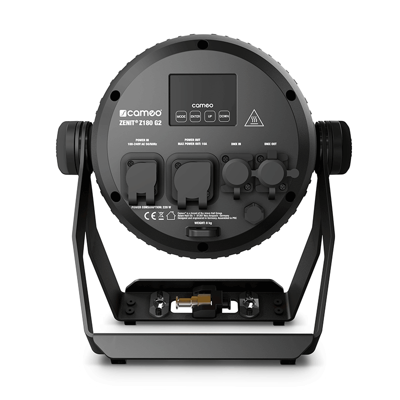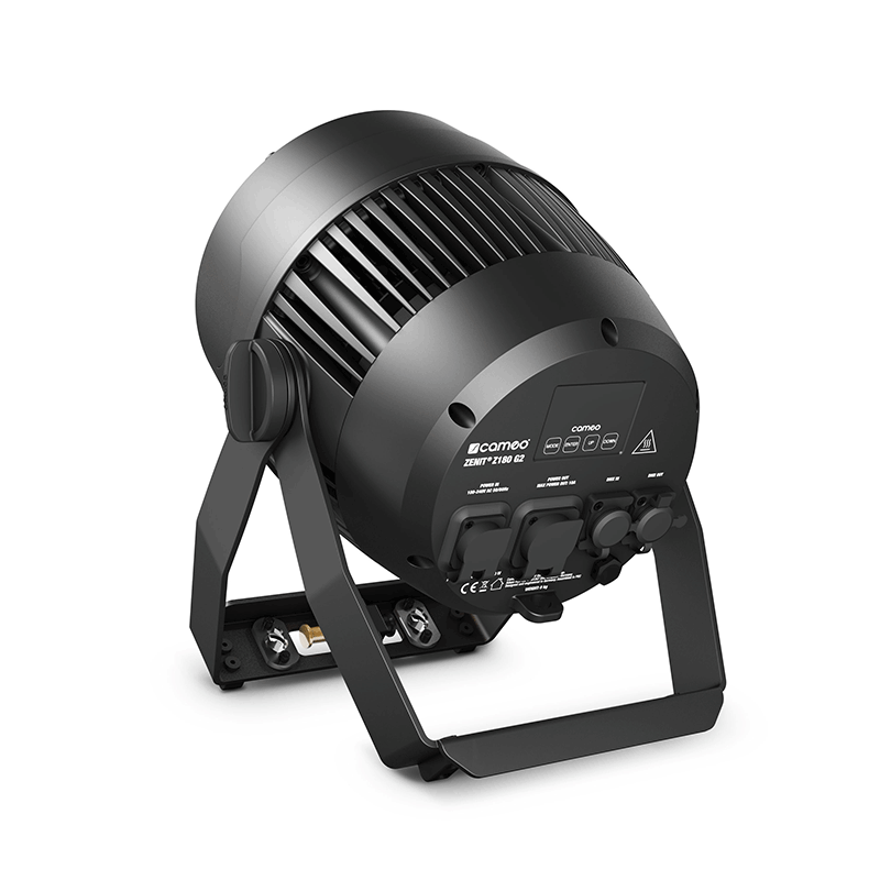 Versatile and rapid rigging plus convenient, trouble-free configuration - the ZENIT® Z 180 G2 is the new kid on the block. It enables super clamp mounting in no time now featuring innovative and patented SPIN16® technology that integrates a 16 mm TV spigot in the mounting bracket and a bright OLED menu display. Designed for demanding professional applications, the RDM enabled high output PAR can employs a single long-life 180 watt RGBW COB LED and 16-bit technology for vivid high-resolution colour mixes with maximum uniformity and perfect dimming behavior. Covering a 10° to 40° range, the motorized zoom provides flexible illumination from tightly focused, narrow beams to wide, diffuse washes. With a 3.600 Hz refresh rate for flicker free operation and IP65 rating the ZENIT® Z 180 G2 is eminently suitable in TV, film and outdoor applications. The PAR can's advanced features include colour temperature correction, variable white balance and 4 selectable dimming curves with adjustable response to mimic the ramp-down of halogen bulbs. Sporting 7 modes of DMX control, the ZENIT® Z 180 G2 is also capable of master, slave and standalone operation. A bright OLED display with 4 back-lit touch buttons facilitates menu navigation and configuration while a security lock prevents unauthorized access. The heavy-duty diecast aluminium housing includes a temperature controlled fan for virtually noiseless operation. 5-pin DMX and powerCON TRUE1 compatible connectors facilitate daisy chaining and power linking. The Cameo ZENIT® Z 180 G2 runs on all voltages from 100 - 240 V AC.