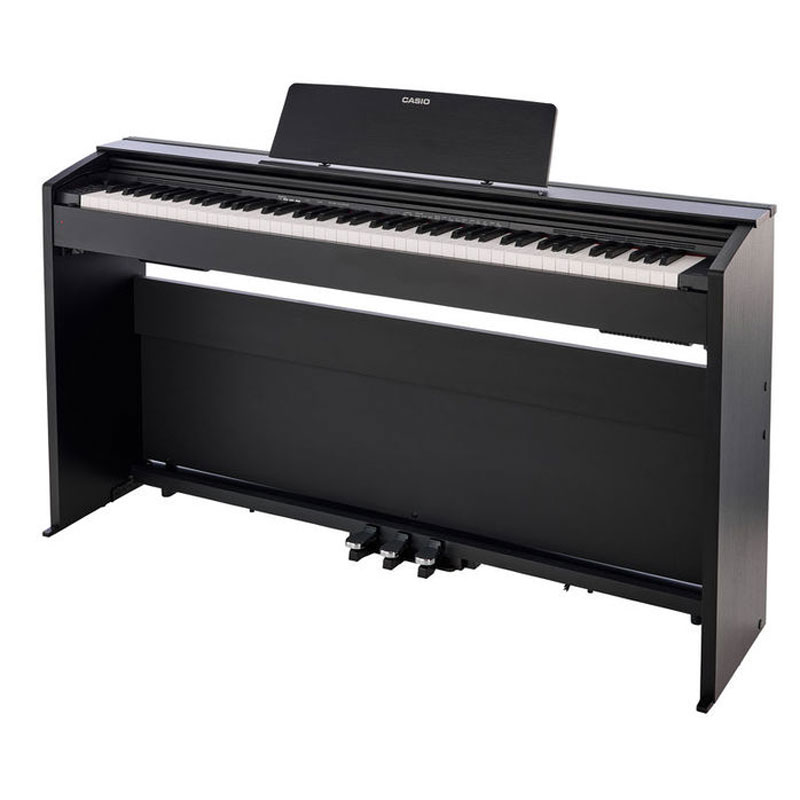 Casio PX-870 BK C7 električni klavir. The PX-870 has a completely new sound projection feature for improved natural sound emission. The nuanced damper and string resonance simulation provides a realistic concert grand piano experience. Additional features, such as the lid position simulator, Volume Sync EQ, headphone mode EQ and the audio recording function make this CASIO instrument a compact marvel of functionality and acoustics. The Concert Play function also allows the pianist to practise and play the piano part with an orchestral accompaniment. The top-of-the-range PRIVIA model combines all of the achievements of CASIOs AiR technology into one new compact design.