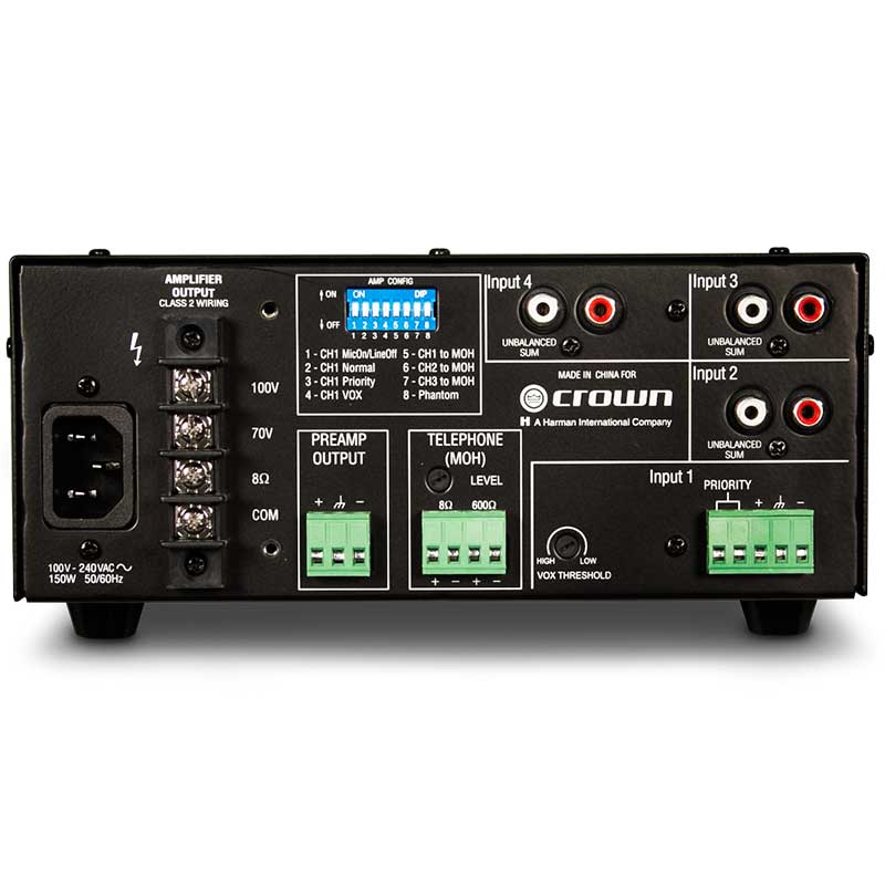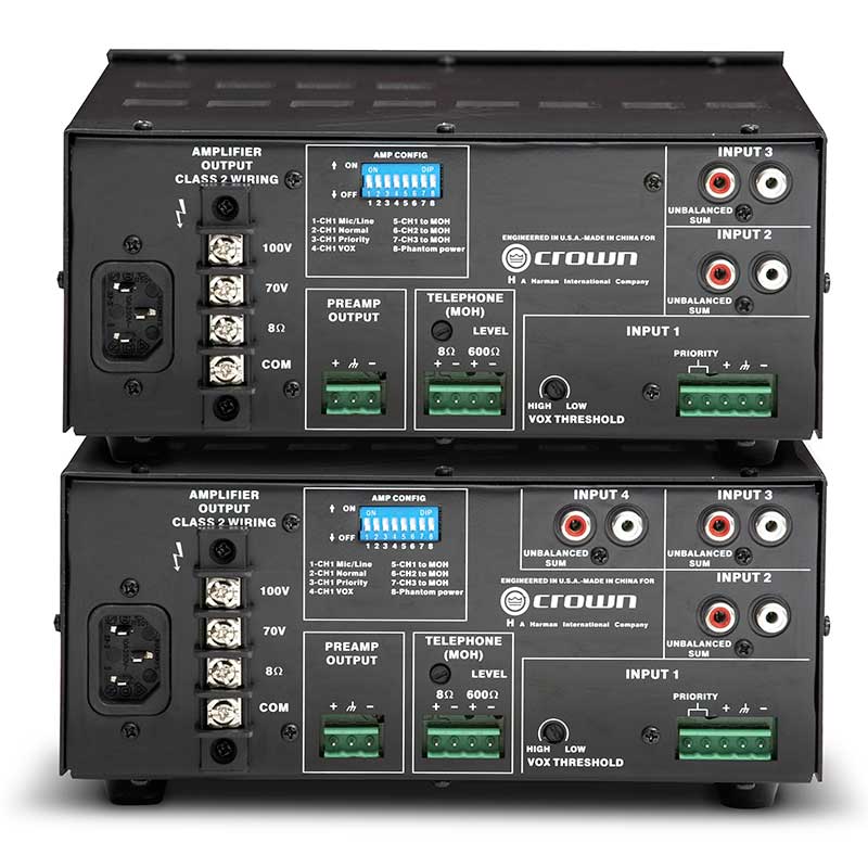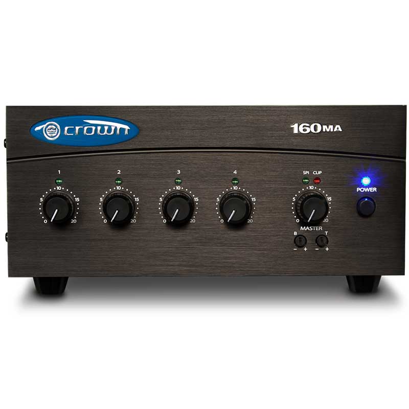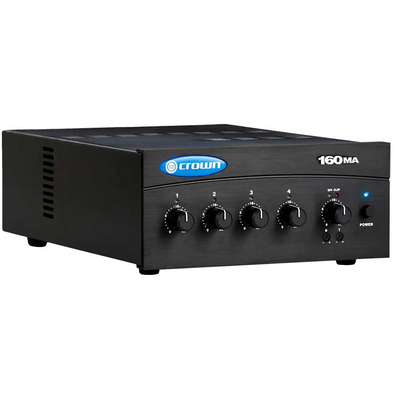 Crown's 135MA and 160MA are high value mixer-amplifiers for commercial audio. They provide 8-ohm and constant-voltage outputs (70V and 100V). Typical uses are paging, background music, and music-on-hold. The 135MA provides 3 inputs (each with a volume control) and a 35W amplifier output. The 160MA provides 4 inputs (each with a volume control) and a 60W amplifier output. Other features include priority muting, voice activated muting, phantom power, and bass and treble controls.