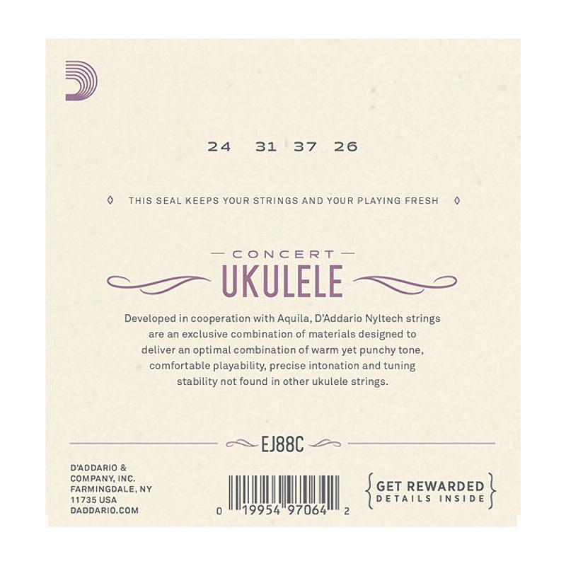 D'Addario EJ88C Nyltech set žica za ukulele koncert veličine. Patentirani Nyltech materijal nudi bogat, topao ton sa jasnom definicijom. Komplet je optimizovan za standardni GCAE štim, i osigurava preciznu intonaciju, i vrhunsku svirljivost. Savršen izbor za pravi, tradicionalni ukulele ton.