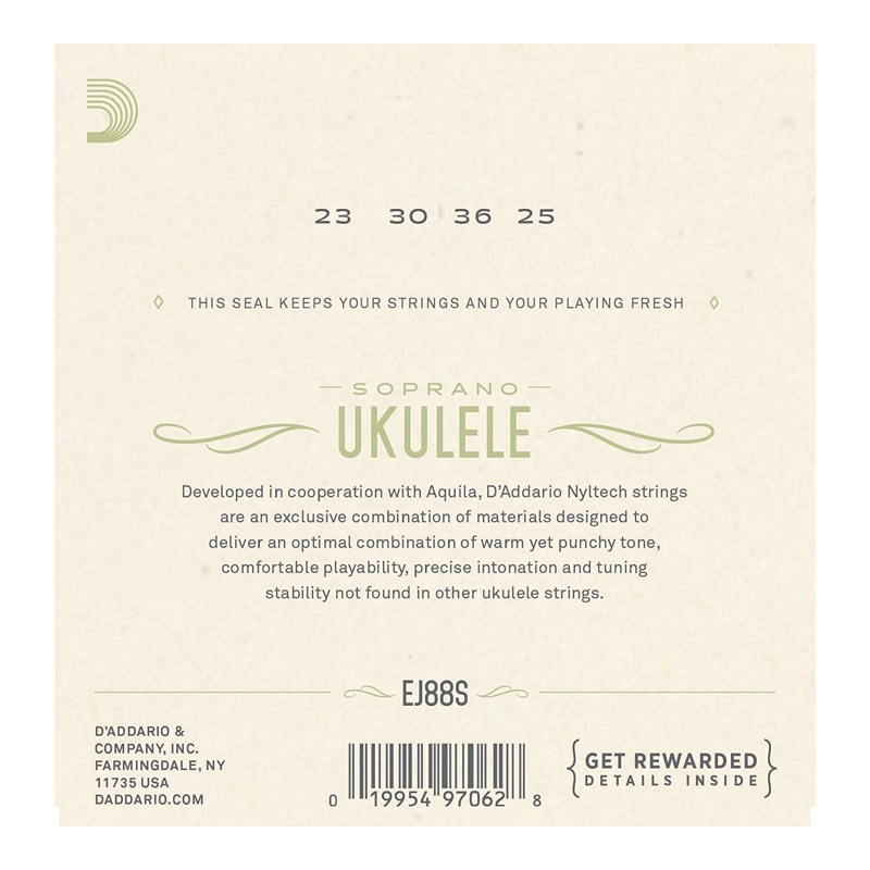 D'Addario EJ88S Nyltech set žica za ukulele soprano veličine. Patentirani Nyltech materijal nudi bogat, topao ton sa jasnom definicijom. Komplet je optimizovan za standardni GCAE štim, i osigurava preciznu intonaciju, i vrhunsku svirljivost. Savršen izbor za pravi, tradicionalni ukulele ton.