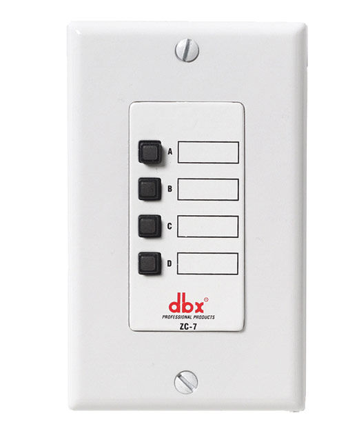 The remote device shall provide programmable push-to-talk page assignment for the dbx® ZonePro™ devices...The remote device shall provide programmable push-to-talk page assignment for the dbx® ZonePro™ devices. The remote device shall have DIP switches allowing identification with connection to the processing device via CAT 5 cable on RJ-45 connectors. The device shall be a dbx ZC-7 remote controller.