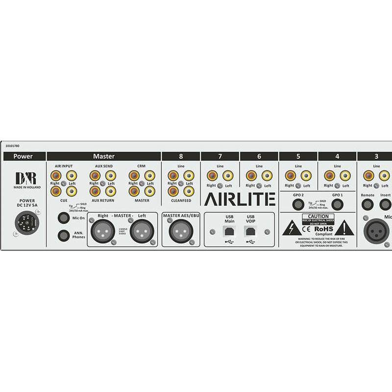 D&R AirLite-USB VOIP MK2 radijska mikseta. Osmokanalna broadcast mikseta sa USB priključkom. Idealna mikseta za upotrebu u kućnim uslovima, snimanje glasovnih numera ili internet radio. Poseduje tri standardna mikrofonska XLR kanala, VOIP i četiri USB kanala za direktnu kontrolu automatizacije softvera.