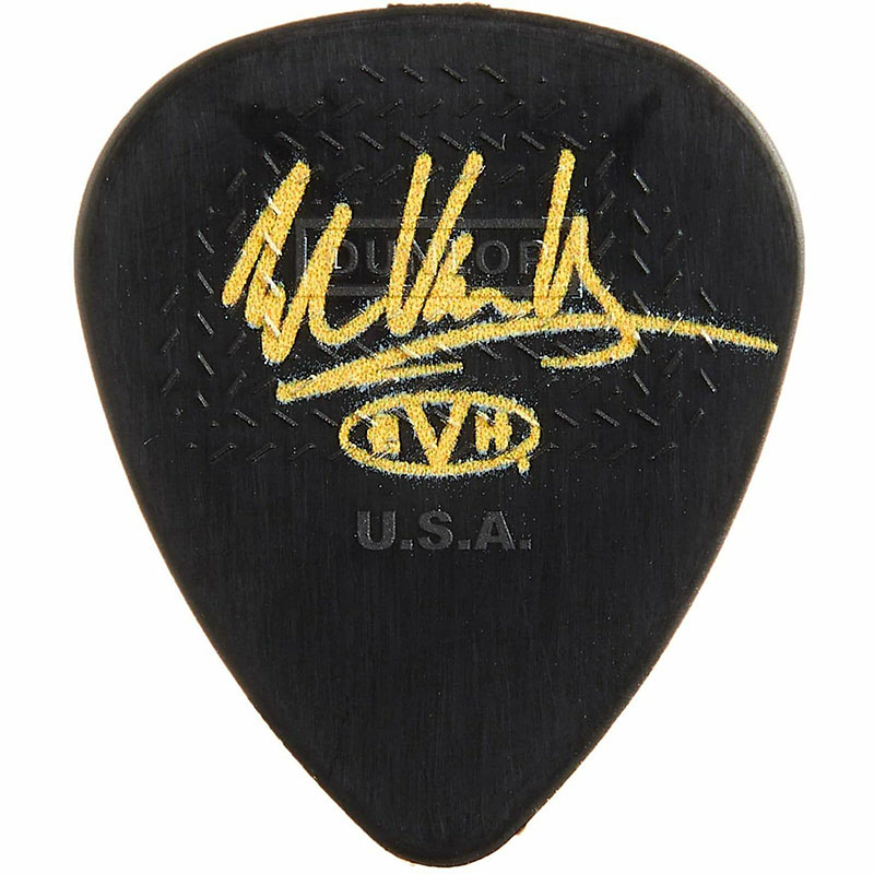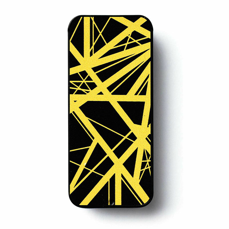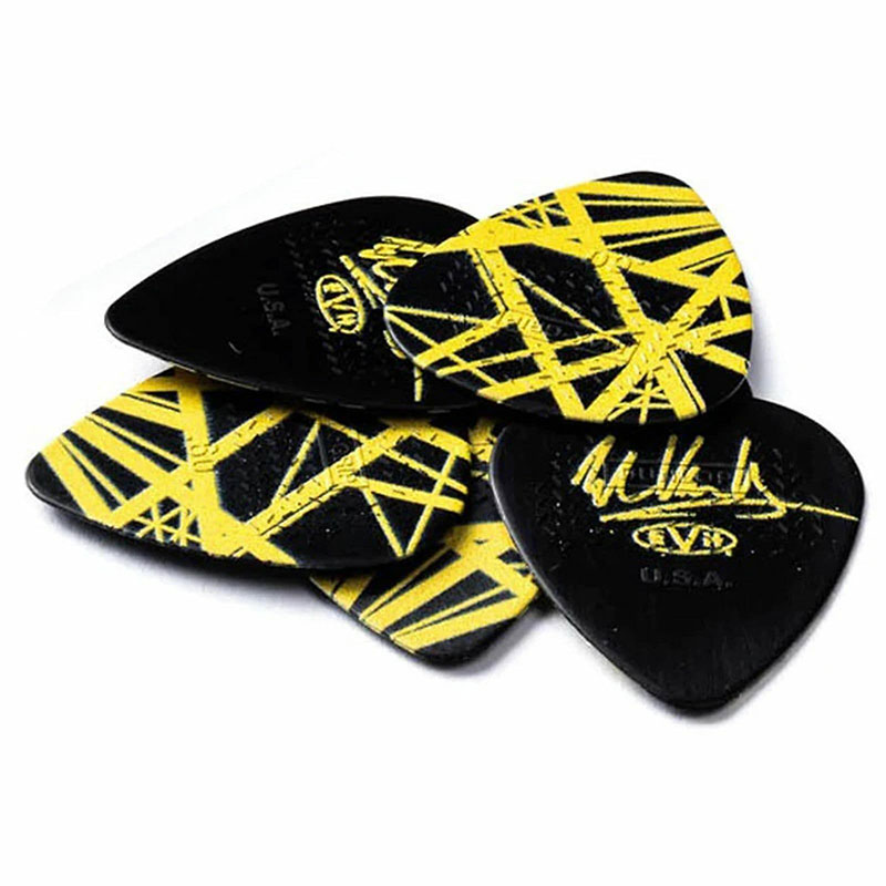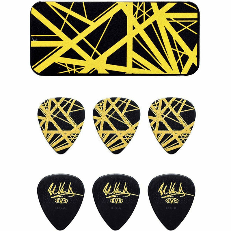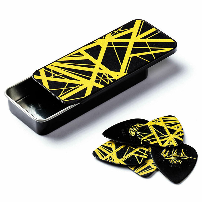 - Package features graphic artwork sourced from Eddie Van Halen’s black-with-yellow-stripes guitar, Bumblebee, which was introduced to the world in 1979. This is the exact pick that Eddie used, a Dunlop Max-Grip .60mm gauge pick. The black with yellow stripes graphic combined with the unmistakable Max-Grip feel makes for a pick that looks and performs second to none. This is one of 5 EVH Graphic Series Picks Tins, each containing 6 picks.