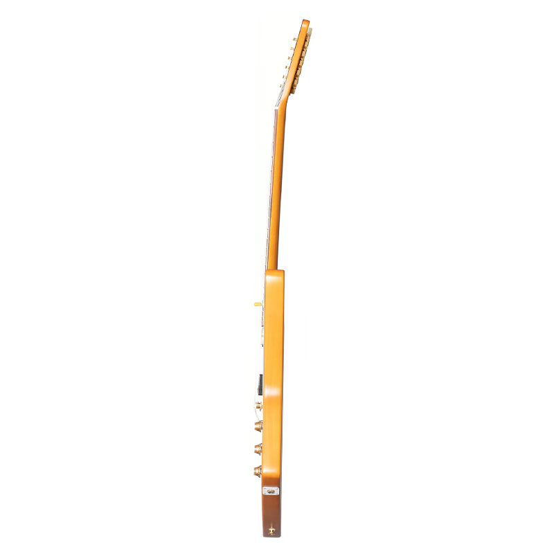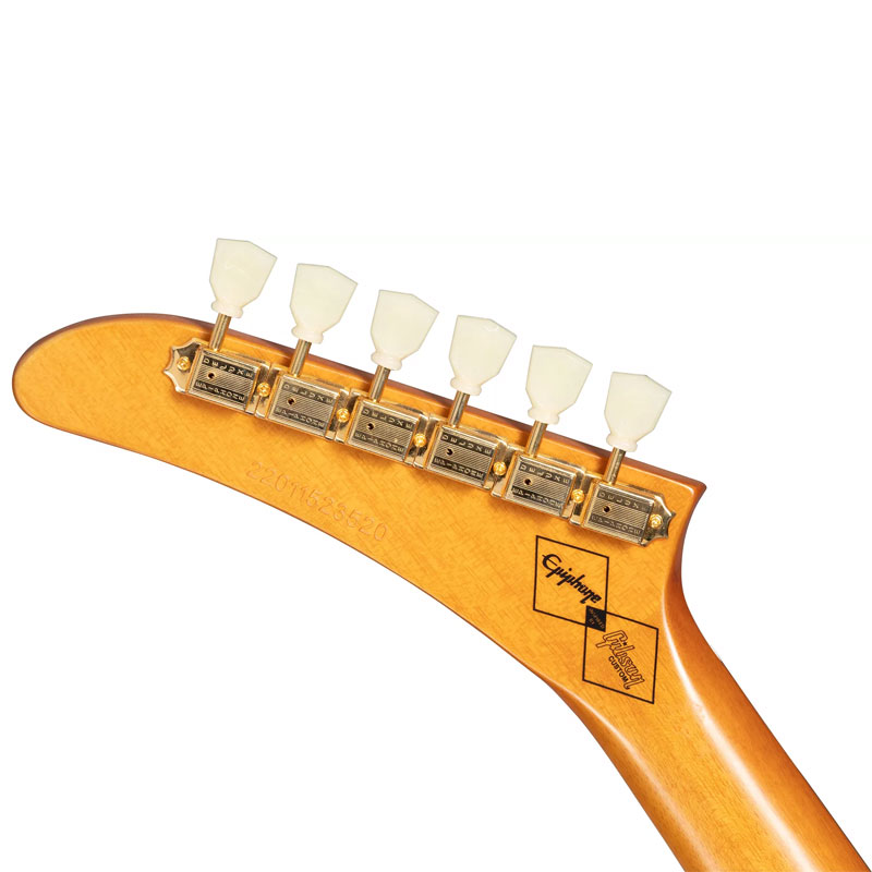 - Takođe je opremljena grifom od indijskog lovora i zlatnim hardverom. Elektronika je takođe vrhunska, sa Gibson Burstbucker™ 2 i Burstbucker 3 pikapima povezanim na pojedinačne kontrole jačine zvuka i master kontrolu tona sa CTS® potenciometrima i Mallory™ kondenzatorom, zajedno sa Switchcraft® 3 prekidačem za izbor pikapa i 1/4” izlaznim priključkom. Logo Epiphone x Gibson Custom na poleđini glave gitare je takođe ponosno prikazan, a uključen je hard case.