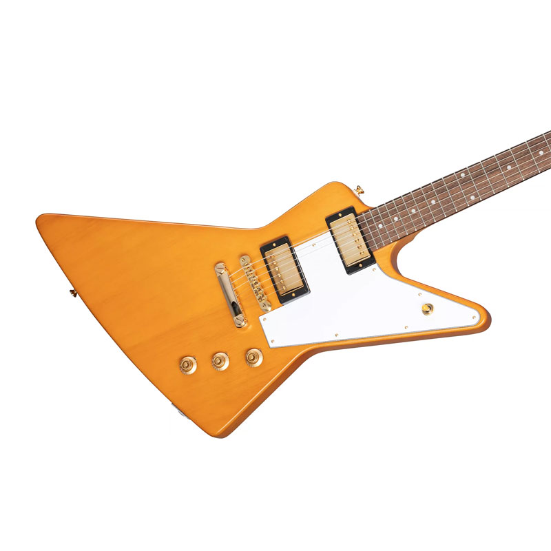 Epiphone 1958 Korina Explorer Aged Natural (L0560773). Napravljena u partnerstvu sa Gibson™ Custom Shop-om, Korina Explorer™ iz 1958. godine je Epiphonova impresivna rekreacija jedne od najpoznatijih i najvrednijih vintage gitara ikada napravljenih. Ona donosi autentične detalje Explorer-a iz 1958. godine po revolucionarnoj ceni. Kao i ultra-retki originalni Gibson modeli iz 1958. godine, ima čvrsto Korina telo i Korina vrat sa dugim profilom vrata Explorer-a iz 1958. godine.