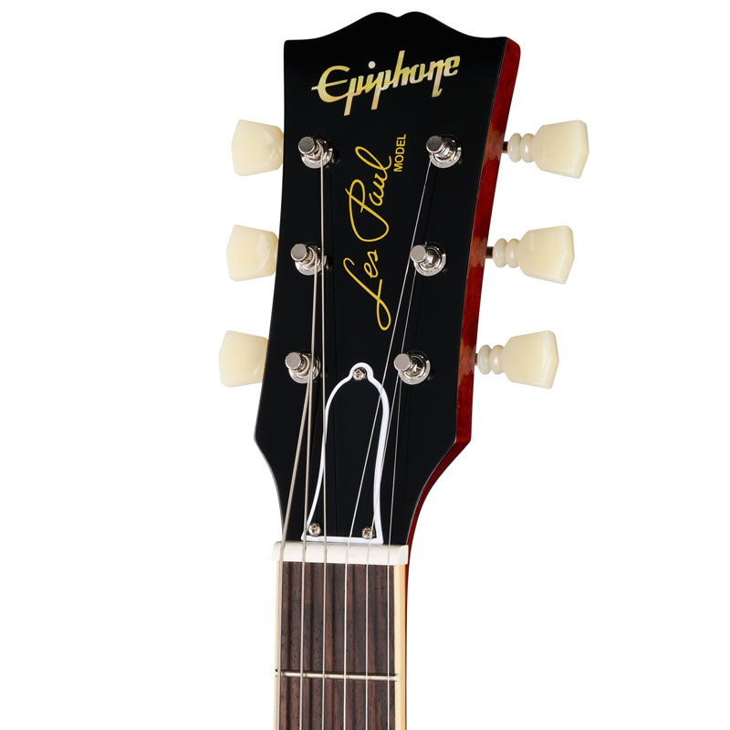 - Takođe ima sedefaste trapezoidne intarzije grifa, logo glave gitare Epiphone od starog sedefa i reči „Les Pau Model“ ispisane zlatnom sito štampom na glavi gitare u stilu Gibsona u obliku „otvorene knjige“. Čak su i bočni markeri položaja tačaka iste veličine kao na vintage modelima Les Paul Standard iz 1960. godine i postavljeni su na istorijski tačne lokacije.
