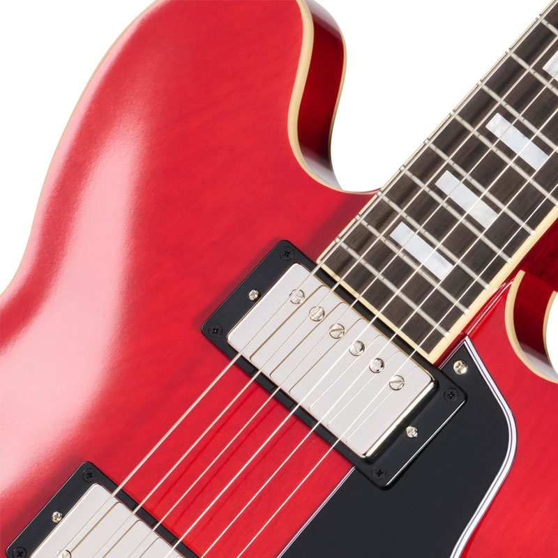 - Klasični elementi dizajna poput zaobljenih proreza, malih blok inleja i tankog profila vrata dočaravaju nepogrešivu atmosferu šezdesetih, dok kombinacija laminiranog tela od javora/topole, čvrstog centralnog bloka od javora i visokokvalitetnih komponenti otelotvoruje idealan spoj vintage tona i moderne svirajuće sposobnosti. Njen prepoznatljivi ton pokreću dva ručno ožičena Gibson Custombucker pikapa, koji pružaju taj klasični PAF ton sa bogatom jasnoćom, toplinom i izuzetnim dinamičkim odzivom.