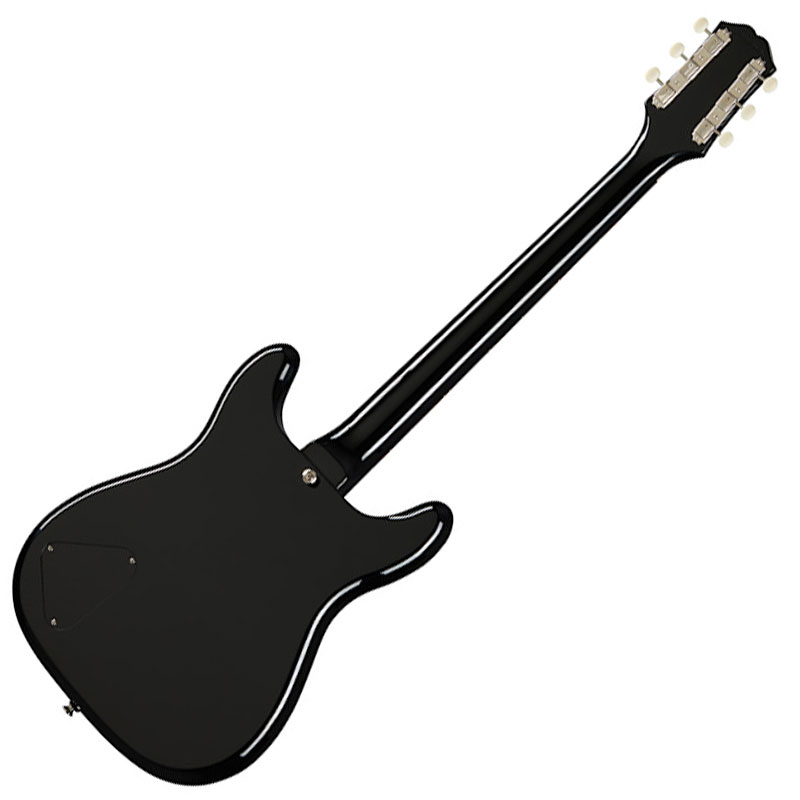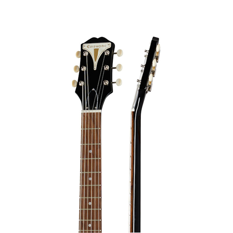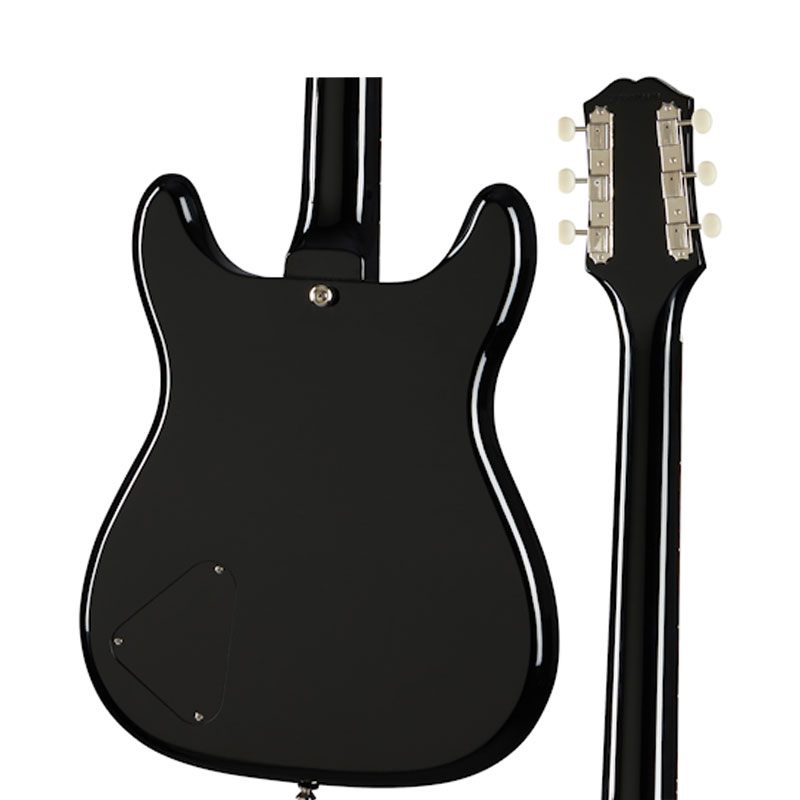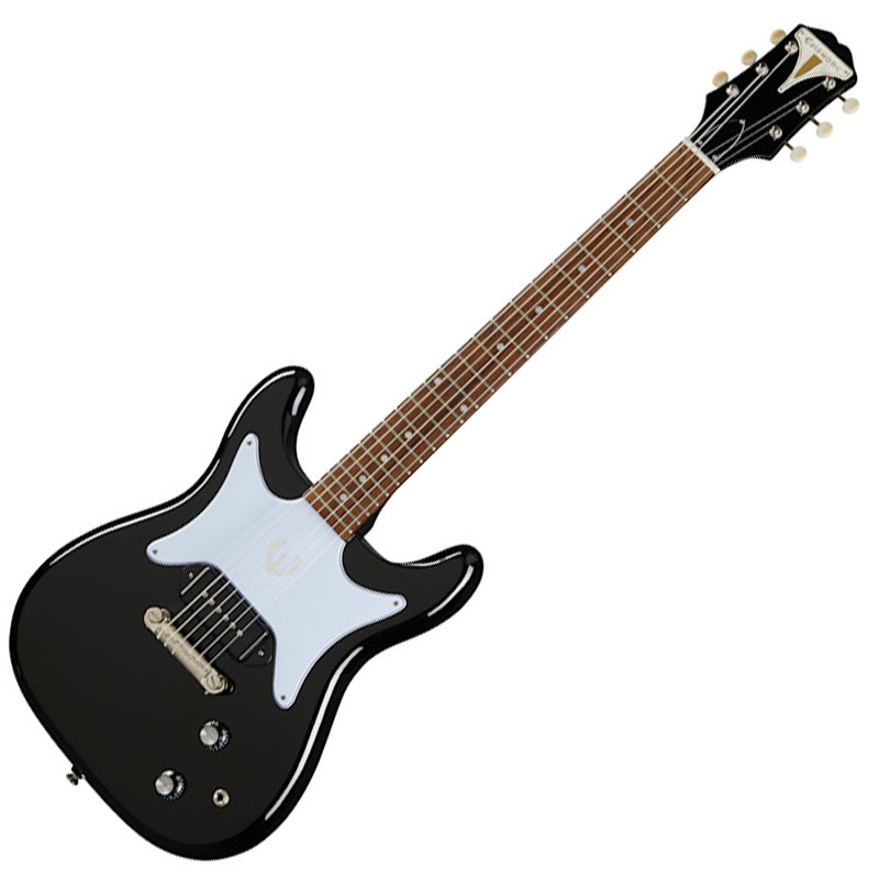 Epiphone Coronet Ebony električna gitara (L0560600). Prvi put predstavljena 1958. godine, Epiphone Coronet je jedan od prvih i najuspešnijih originalnih dizajna električnih gitara sa čvrstim telom kompanije Epiphone. Najnovija verzija vraća mnoge karakteristike ranih Coronet modela, uključujući simetrično telo od mahagonija sa dvostrukim izrezom i jednim Epiphone PRO™ P-90 Dogear magnetom, smanjenu glavu gitare Kalamazoo sa tri sa strane, Epiphone Bikini značkom i čivijama od slonovače, kao i beli pikgard u obliku leptira sa folijskim E logom.