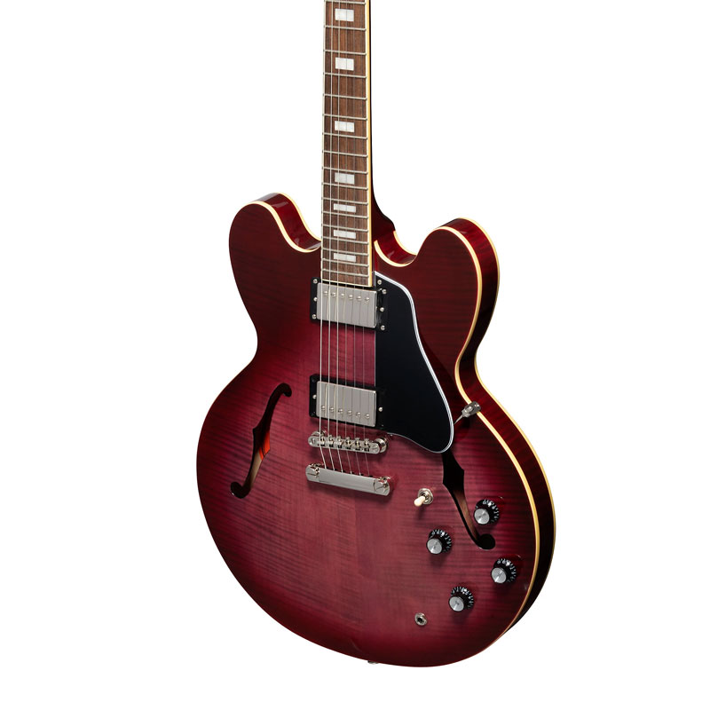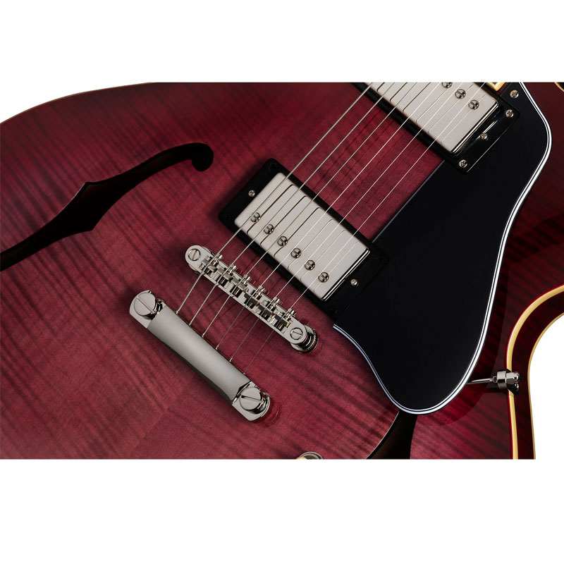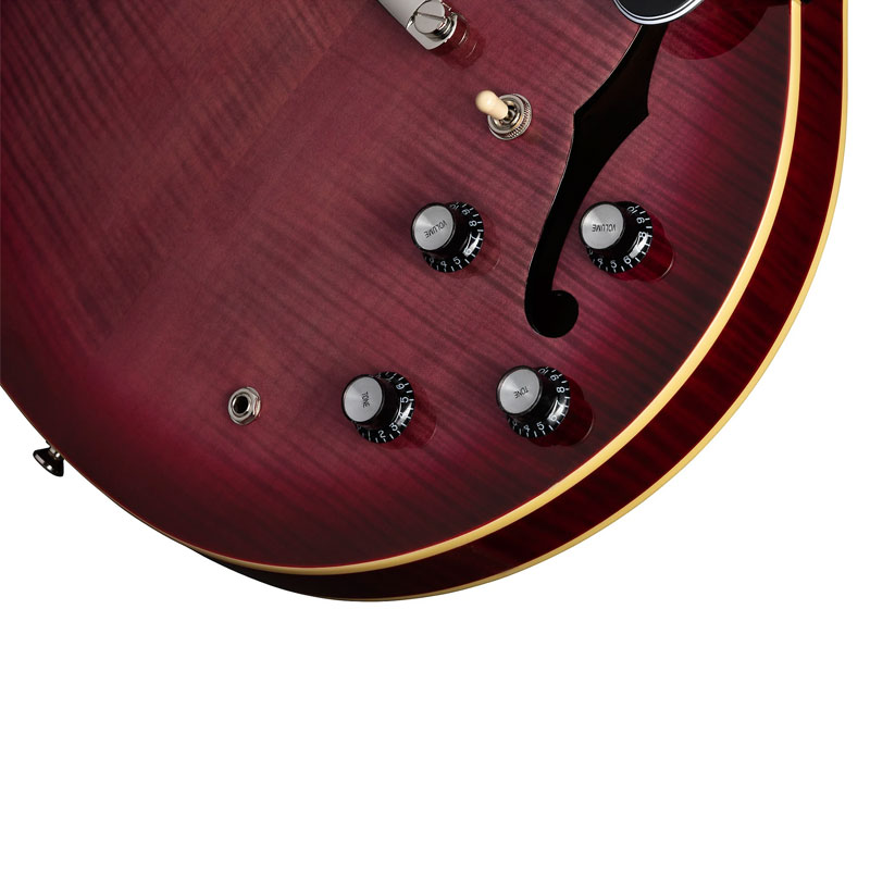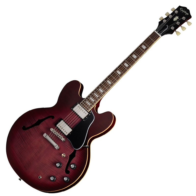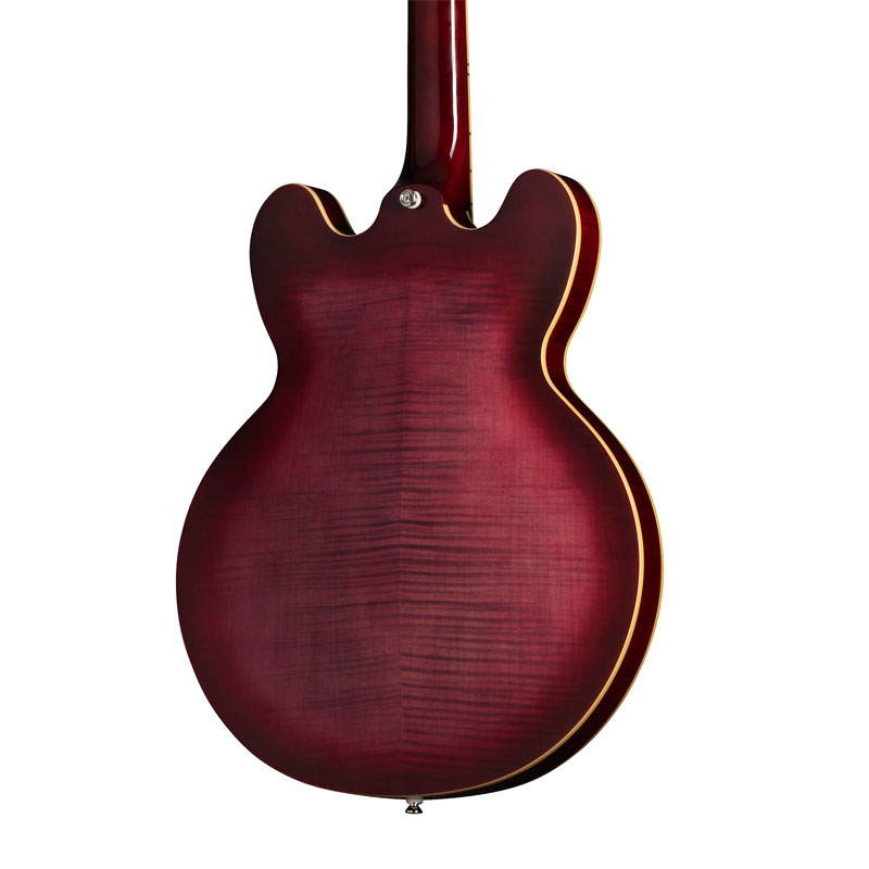Epiphone ES-335 Figured Raspberry Burst (L0560577) odaje počast besmrtnom ES-335, tankom polušupljem archtopu koji je doneo klasu archtopa u rock eru.