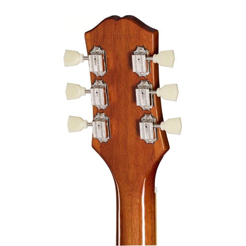 - Ova gitara je izrađena sa telom od mahagonija, javorovim topom sa AAA furnirom od plamenog javora, zaobljenim srednjim mahagonijem u obliku slova C iz 1959. godine sa dugim čepom vrata, lovorovom pločom za grifove sa klasičnim trapezoidnim intarzijama, Epiphone Vintage Deluxe štimerima, parom kritički priznatih Epiphone Probucker™ hambakera™ i zlatnim Top Hat potovima sa kazaljkama. Ovaj originalni Epiphone „Inspired by Gibson“ model takođe ima glavu gitare Kalamazoom Graph Teck® nut i CTS® potenciometre. Takođe je uključena i premium torba.