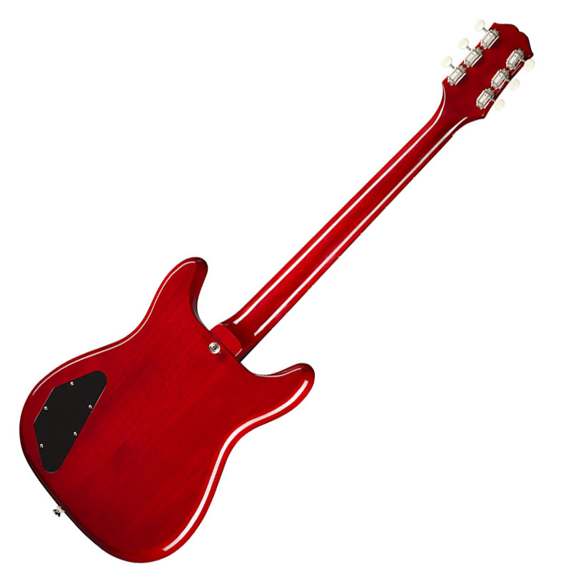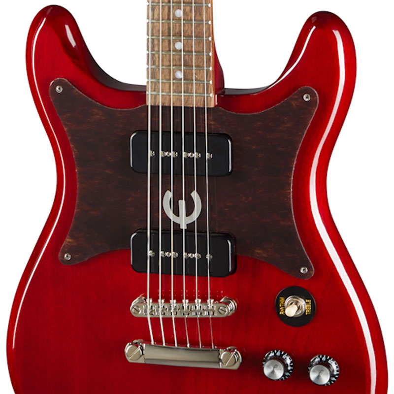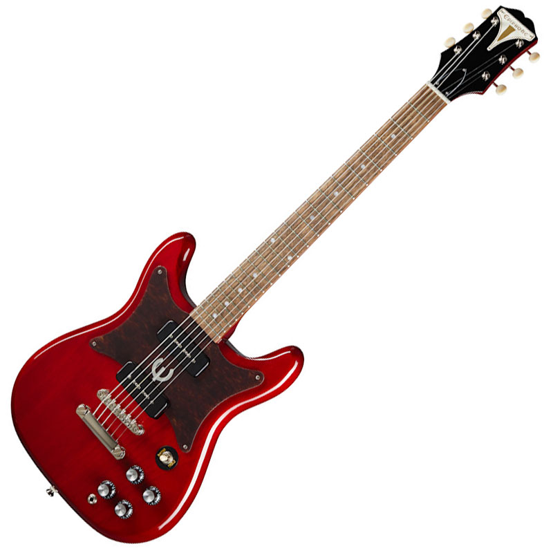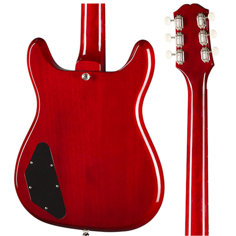 Epiphone Wilshire P-90 Cherry električna gitara (L0560597). Prvi put predstavljena 1958. godine, Epiphone Wilshire je jedan od prvih i najuspešnijih originalnih dizajna električnih gitara sa čvrstim telom kompanije Epiphone. Najnovija verzija vraća mnoge karakteristike ranih Wilshire modela, uključujući simetrično telo od mahagonija sa dvostrukim izrezom i dual Epiphone PRO™ P-90 Soapbar magnetom, smanjenu glavu gitare Kalamazoo sa tri sa strane, Epiphone Bikini značkom i čivijama od slonovače, kao i beli pikgard u obliku leptira sa folijskim E logom.