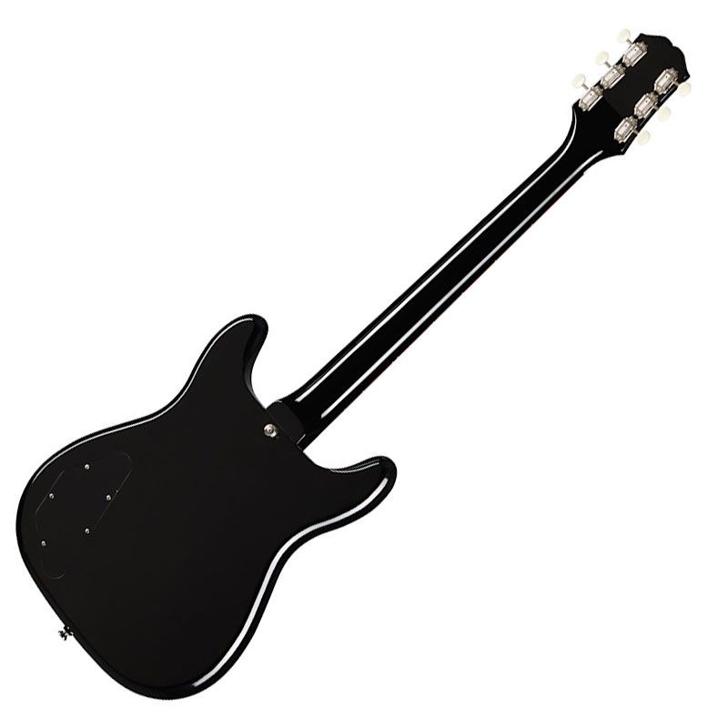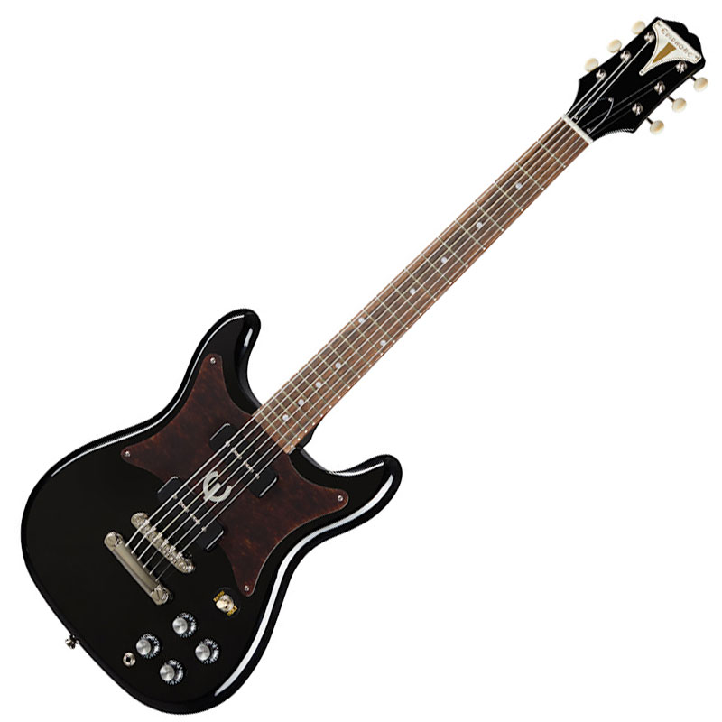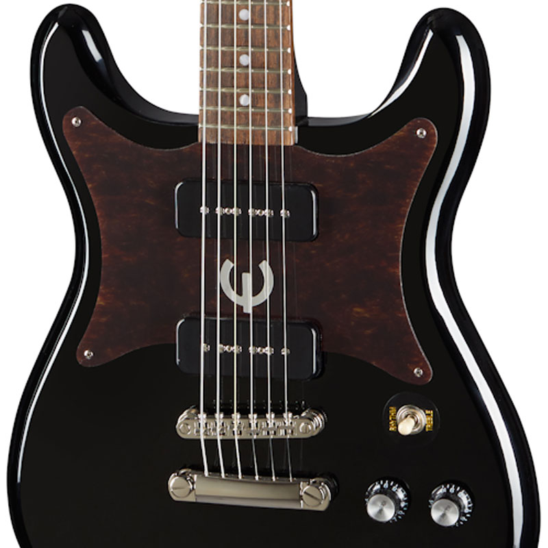 Epiphone Wilshire P-90 Ebony električna gitara (L0560598). Prvi put predstavljena 1958. godine, Epiphone Wilshire je jedan od prvih i najuspešnijih originalnih dizajna električnih gitara sa čvrstim telom kompanije Epiphone. Najnovija verzija vraća mnoge karakteristike ranih Wilshire modela, uključujući simetrično telo od mahagonija sa dvostrukim izrezom i dual Epiphone PRO™ P-90 Soapbar magnetom, smanjenu glavu gitare Kalamazoo sa tri sa strane, Epiphone Bikini značkom i čivijama od slonovače, kao i beli pikgard u obliku leptira sa folijskim E logom.