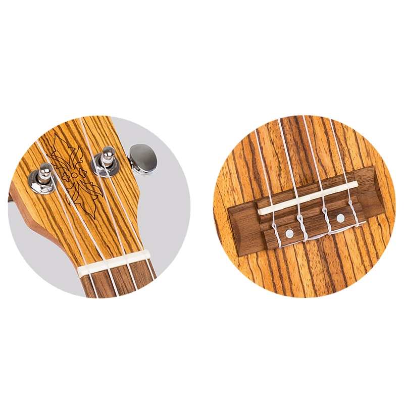 - Premium Features: Arched back, Chrome Die-Cast Geared Tuners, Laser Engraved Rosette, Aquila Super Nylgut Strings, Side dots