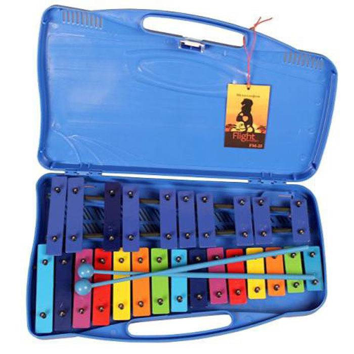 Flight FM-25 metalofon. Flight FM25 dvoredni metalofon u plastičnom koferu plave boje. Poseduje 25 nota u različitim bojama i dva plastična balansirana batića za sviranje. Odličan metalofona za učenike osnovne škole.