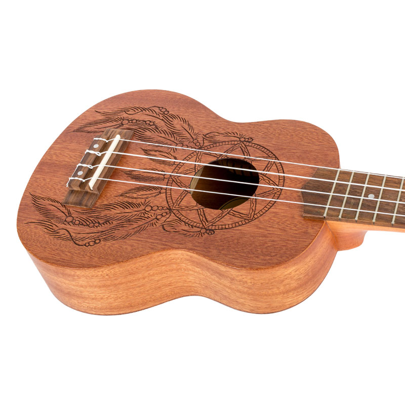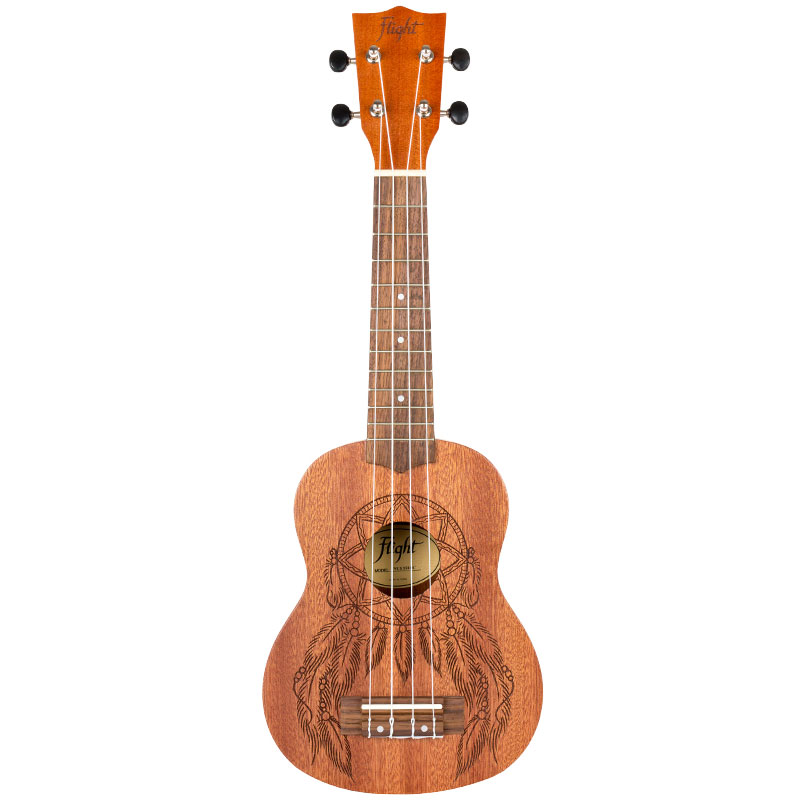 Flight NUS350 Dreamcatcher Soprano ukulele. Perhaps our craziest ukulele to date, the NUS350 DC is a rebellious twin brother of the NUS310. Just how gorgeous is the engraving of a dreamcatcher on this ukulele?