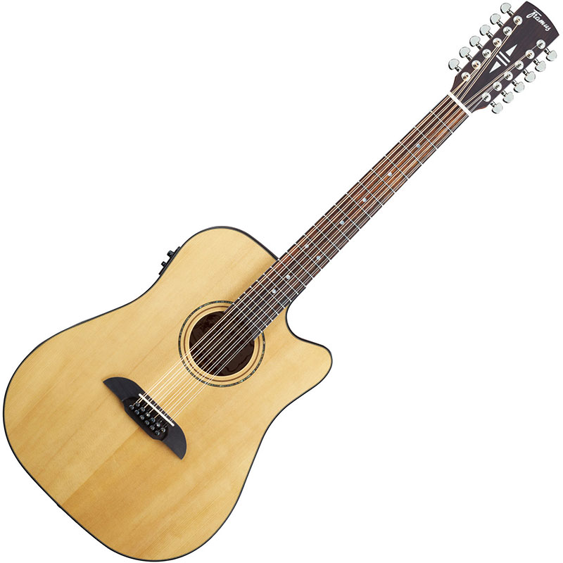 Framus FD 14 SV CE VSNT12-String & EQ 12-strings Legacy Series acoustic guitar with Cutaway. Dreadnought body shape. Scale: 648 mm, Top: Solid A Sitka Spruce, Sides: Laminated Mahogany, Back: Laminated Mahogany, Bridge: Indian Rosewood, Saddle: Bone, compensated, Neck: Mahogany, with trussrod, satin finish, Neckprofile: C-profile, Headstock: Indian Rosewood veneer, with Mother of Pearl Framus logo and inlay Tuners: Closed, gear ratio 15:1, Nut: Bone, 48 mm, Frets: 21, Medium, Fretboard: East-Indian Rosewood, Fretboard Radius: 16", Bridge Pins: Ebony with mother of Pearl Inlay Dots, Electronics: Fishman Isys + Preamp with Sonicore Pickup, Strings: Cleartone Acoustic 012 - 053 (7412), Finish: Vintage Transparent Satin Natural Tinted.