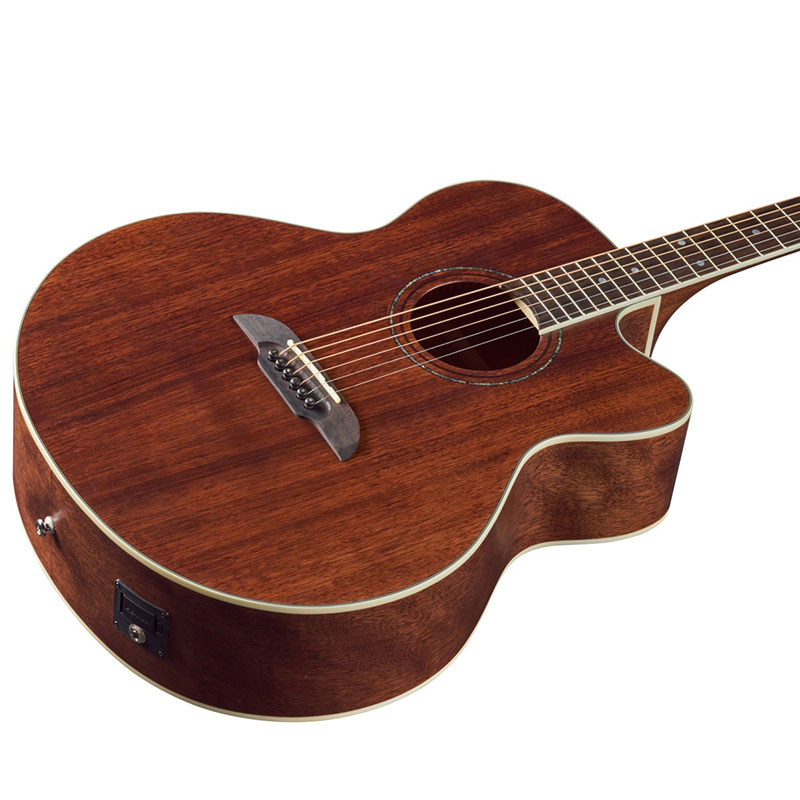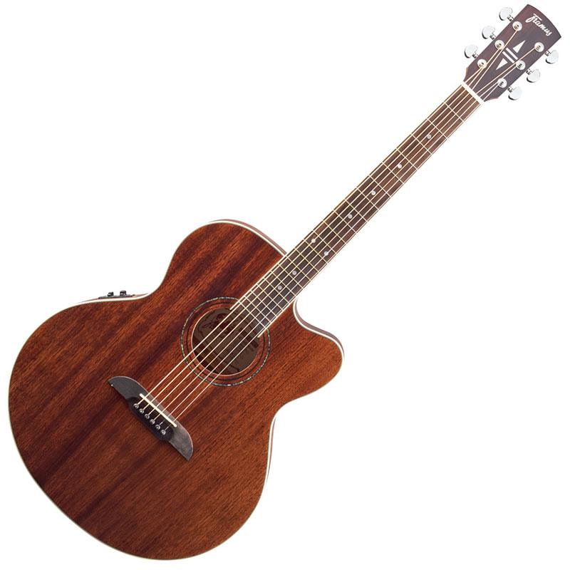 Framus FJ 14 M NS CE Jumbo. with Presys II EQ If big bodied, deep sounding guitar at a budget is what you are after then you must check the Framus Legacy series FD 14 M NS CE Jumbo. It is an all Mahogany guitar with much charm and character. It sounds like it looks. deep and warm with focus on the low and mid frequencies, great for pick strumming and drop D. The FD 14M NS CE here is stage ready with the Fishman Sonicore pickup combined with the Isys + Preamp, it has a cutaway too. If you do not need electronics and cutaway and would like to keep it simple. check the FD 14M by Framus as it is the same model without these features.