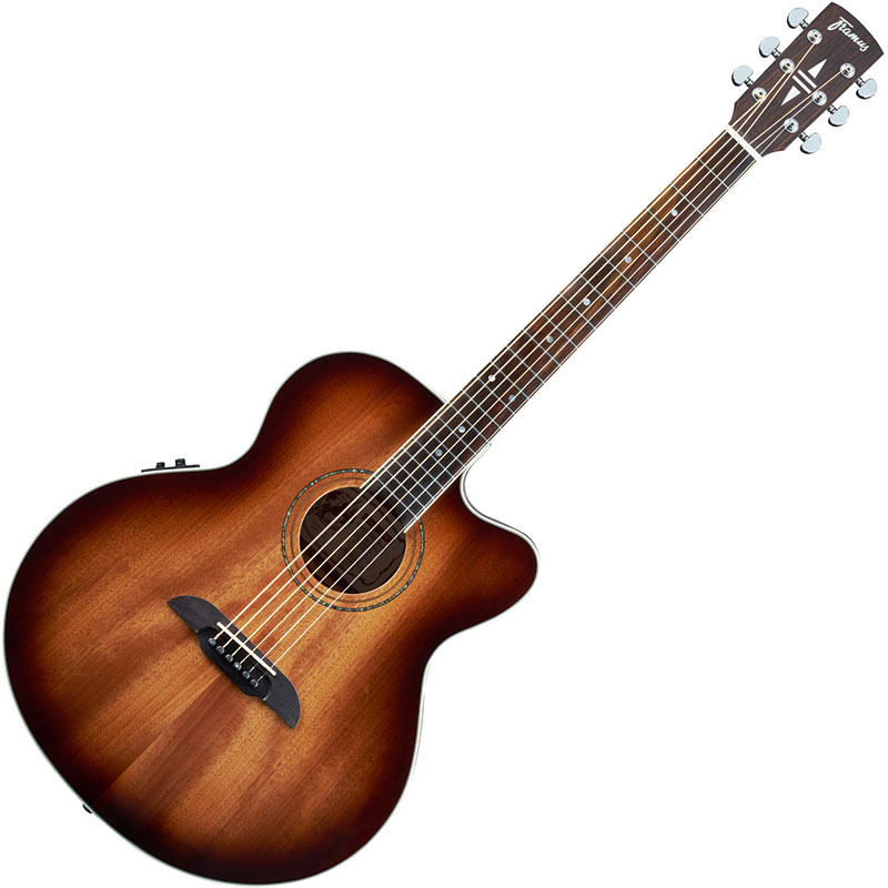 Framus FJ 14 M VS CE Jumbo, with EQ. Legacy Series electric-acoustic guitar with Cutaway. Jumbo body shape. Scale: 648 mm, Top: Solid Mahogany, Sides: Laminated Mahogany, Back: Laminated Mahogany, Bridge: Indian Rosewood, Saddle: Bone, compensated, Neck: Mahogany, with trussrod, satin finish, Neckprofile: C-profile, Headstock: Rosewood veneer, with Mother of Pearl Framus logo and inlay, Tuners: Closed, gear ratio 15:1, Nut: Bone, 45 mm / 1 3/4", Frets: 21, Medium, Fretboard: Indian Rosewood, Fretboard Radius: 16", Electronics: Fishman Isys + Preamp with Sonicore Pickup, Bridge Pins: Ebony with mother of Pearl Inlay Dots, Strings: Cleartone Acoustic 012 - 053 (7412). Finish: Vintage Sunburst Transparent High Polish.