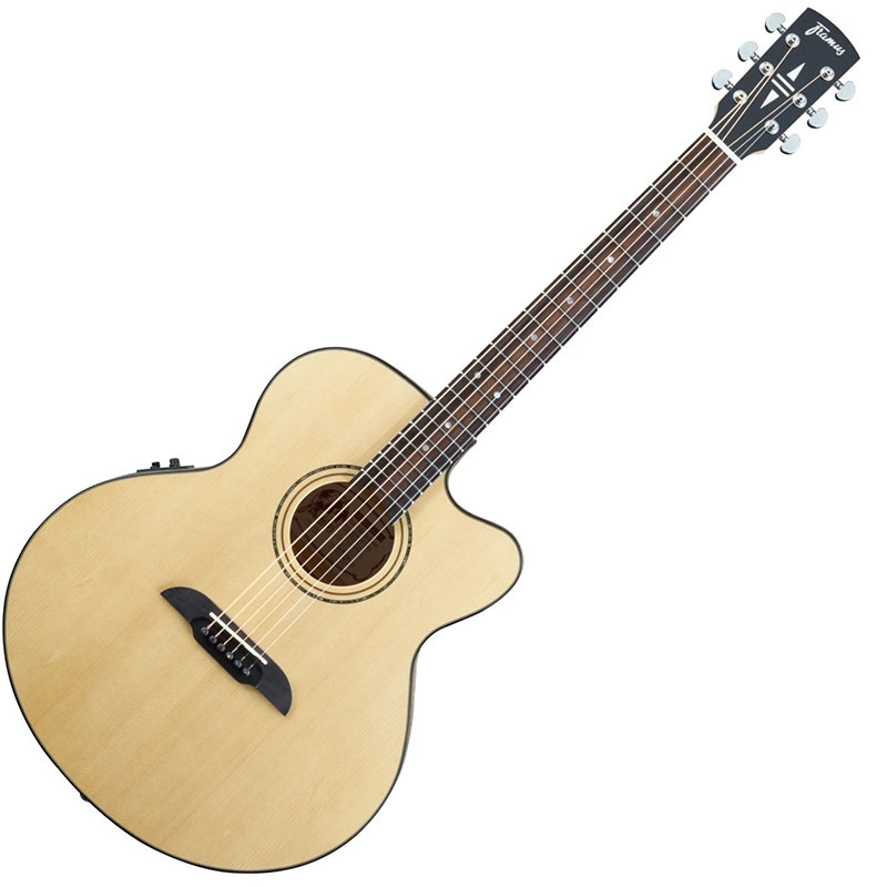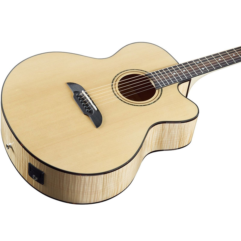 Framus FJ 14 SMV VNT CE Jumbo, with EQ. With it's Solid A Spruce top and AAA flamed Maple body, the FR FJ 14 SMV VSNT CE stands out, as it is simply great looking. Lower emphasis on bass frequencies and more apparent high mids make the Legacy series FJ 14 SMV CE a great choice for guitarists that play with a band, it cuts great through the mix and really stands out with clarity. We personally also liked it a lot when playing with fingers. The Isys + preamp and Sonicore pickup by Fishman are more than enough for it and great to have, although for the purists a non-amplified version of the FJ 14 SMV CE is available. Another finish option you may wanna check is the Vintage Transparent High Polished Natural Tinted finish which can be found on TonePedia.